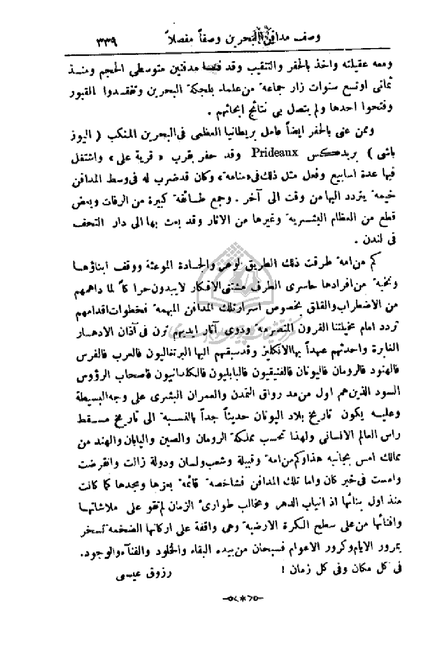 ومعه عقيلته واخذ بالحفر والتنقيب وقد فتحا مدفنين متوسطي الحجم ومنذ ثماني أو تسع سنوات زار جماعة من علماء بلجكة البحرين وتفقدوا القبور وفتحوا أحدها ولم يتصل بي نتائج أبحاثهم.