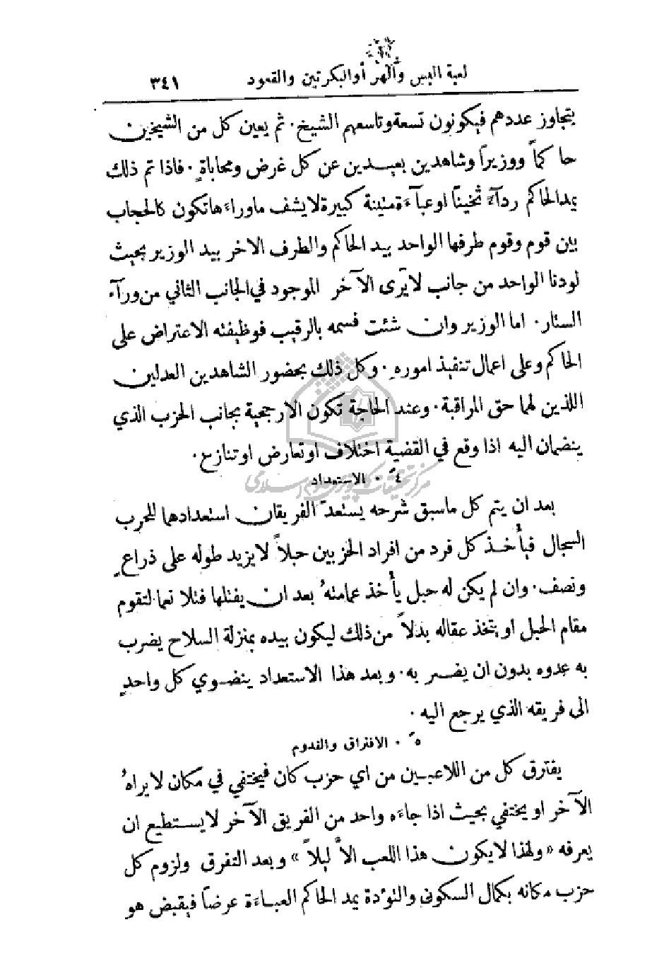 الموجود في الجانب الثاني من وراء الستار. إما الوزير وإن شئت فسمه بالرقيب فوظيفته الاعتراض على الحاكم وعلى أعمال تنفيذ أمورهِ. وكل ذلك بحضور الشاهدين العدلين اللذين لهما حق المراقبة. وعند الحاجة تكون الأرجحية بجانب الحزب الذي ينضمان إليه إذا وقع في القضية اختلاف أو تعارض أو تنازع.
