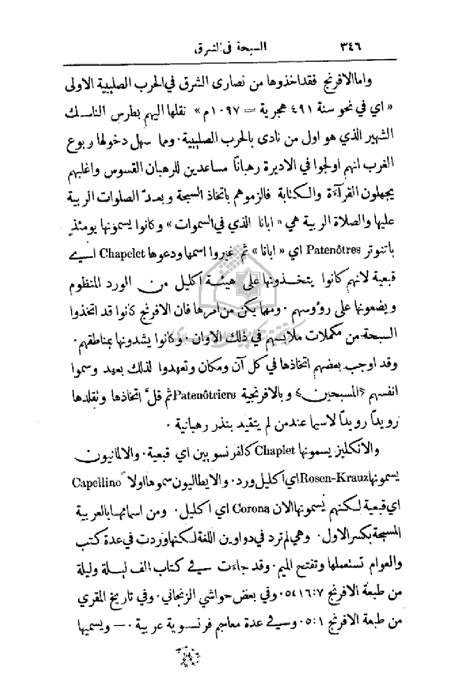 وأما الإفرنج فقد أخذوها من نصارى الشرق في الحرب الصليبية الأولى (أي في نحو سنة 491 هجرية - 1097م) نقلها إليهم بطرس الناسك الشهير الذي هو أول من نادى بالحرب الصليبية. ومما سهل دخولها ربوع الغرب أنهم أولجوا في الأديرة رهباناً مساعدين للرهبان القسوس واغلبهم يجهلون القراءة والكتابة فألزموهم باتخاذ السبحة وبعدّ الصلوات الربية عليها والصلاة الربية هي (أبانا الذي في السموات) وكانوا يسمونها يومئذٍ باتنوتر أي (أبانا) ثم غيروا اسمها ودعوها أي قبعية لأنهم كانوا يتخذونها على هيئة إكليل من الورد المنظوم ويضعونها على رؤوسهم. ومهما يكن من أمرها فأن الإفرنج كانوا قد اتخذوا السبحة من مكملات ملابسهم في ذلك الأوان. وكانوا يشدونها بمناطقهم. وقد أوجب بعضهم اتخاذها في كل آن ومكان وتعهدوا لذلك بعهد وسموا أنفسهم (المسبحين) وبالإفرنجية ثم قلَّ اتخاذها وتقلدها رويداً رويداً لا سيما عند من لم يتقيد بنذر رهبانية.
