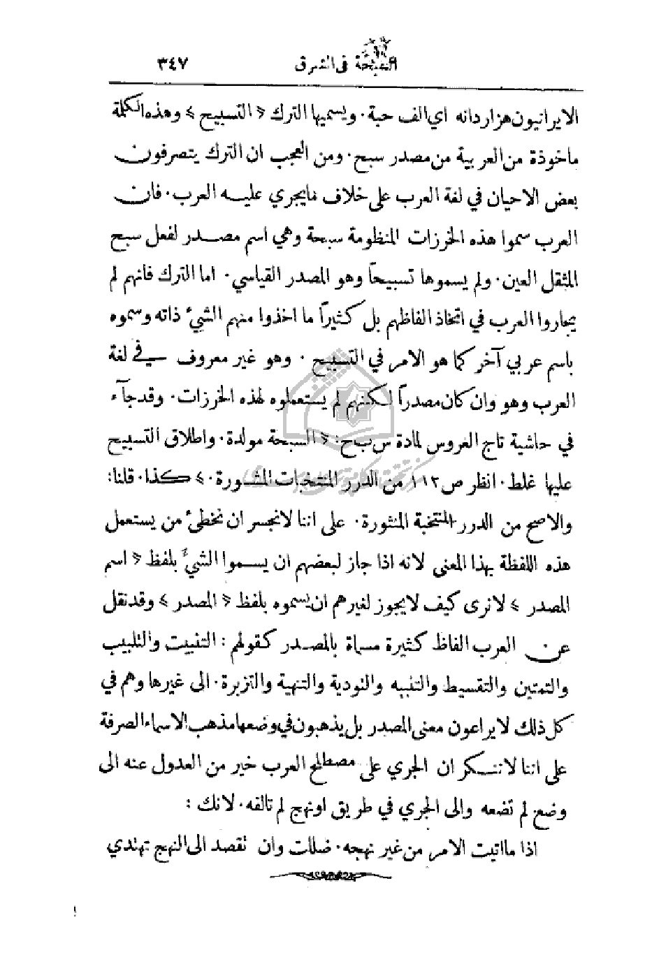 الإيرانيون هزاردانه أي ألف حبة. ويسميها الترك (التسبيح) وهذه الكلمة مأخوذة من العربية من مصدر سبح. ومن العجب أن الترك يتصرفون بعض الأحيان في لغة العرب على خلاف ما يجري عليه العرب. فإن العرب سموا هذه الخرزات المنظومة سبحة وهي اسم مصدر لفعل سبح المثقل العين. ولم يسموها تسبيحاً وهو المصدر القياسي. أما الترك فأنهم لم يجاروا العرب في اتخاذ ألفاظهم بل كثيراً ما اخذوا منهم الشيء ذاته وسموه باسم عربي آخر كما هو الأمر في التسبيح. وهو غير معروف في لغة العرب وهو وإن كان مصدراً لكنهم لم يستعملوه لهذه الخرزات. وقد جاء في حاشية تاج العروس لمادة س ب ح: (السبحة مولدة، وإطلاق التسبيح عليها غلط. انظر ص 112 من الدرر المنتخبات المشورة.) كذا. قلنا: والأصح من الدرر المنتخبة المنثورة. على أننا لا نجسر أن نخطئ من يستعمل هذه اللفظة بهذا المعنى لأنه جاز لبعضهم أن يسموا الشيء بلفظ (اسم المصدر) لا نرى كيف لا يجوز لغيرهم أن يسموه بلفظ (المصدر) وقد نقل عن العرب ألفاظ كثيرة مسماة بالمصدر كقولهم: التنبيت والتلبيب والتمتين والتقسيط والتنبيه والتودية والتهنية والتزبرة. إلى غيرها وهم في كل ذلك لا يراعون معنى المصدر بل يذهبون في موضعها مذهب الأسماء الصرفة على أننا لا ننكر أن الجري على مصطلح العرب خير من العدول عنه إلى وضع لم تضعه والى الجري في طريق أو نهج لم تألفه. لأنك: