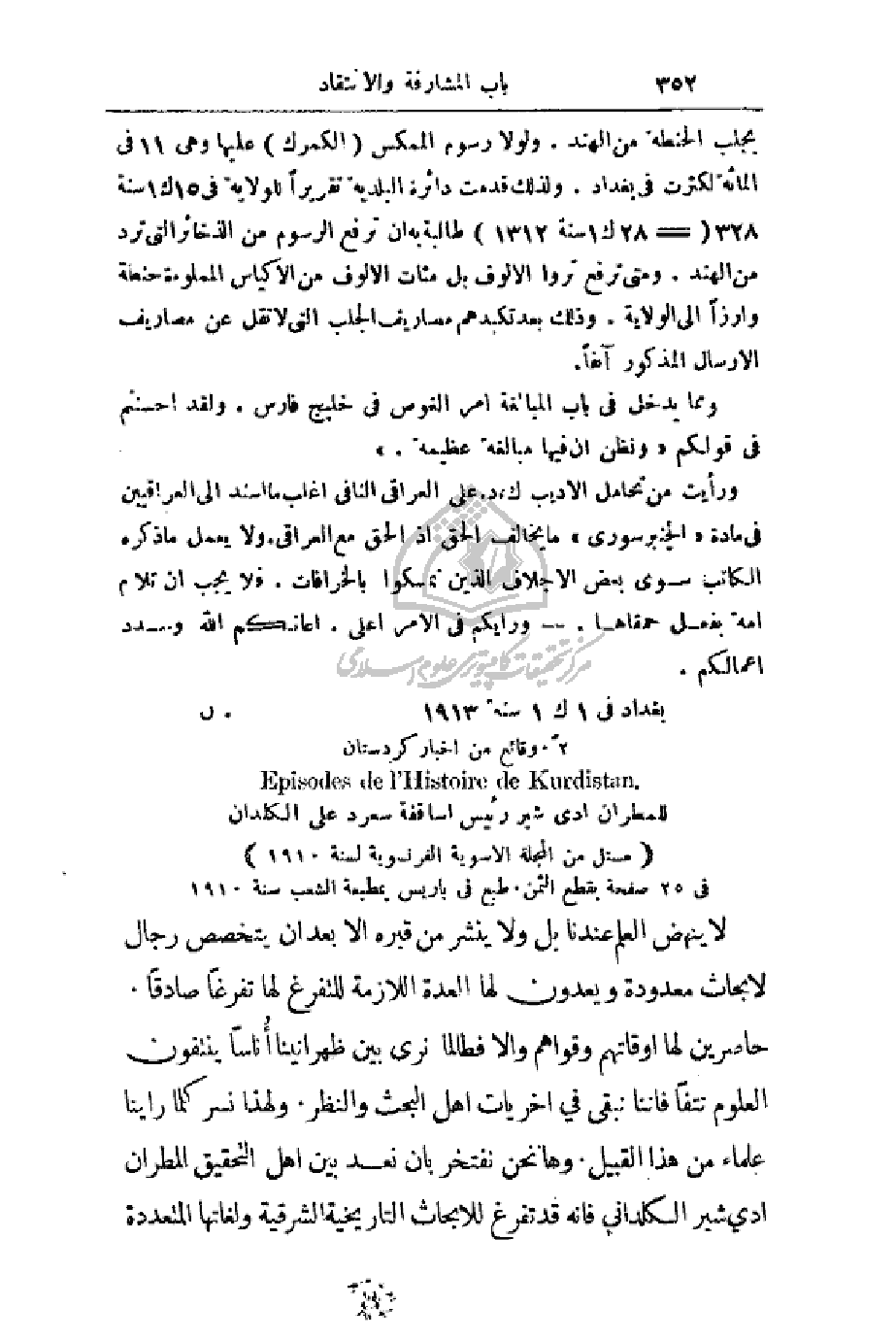 لا ينهض العلم عندنا بل ولا ينشر من قبره إلا بعد أن يتخصص رجال لأبحاث معدودة ويعدون لها العدة اللازمة للتفرغ لها تفرغاً صادقاً. حاصرين لها أوقاتهم وقواهم وإلا فطالما نرى بين ظهرانينا أُناساً ينتفون العلوم نتفاً فأننا نبقى في أخريات أهل البحث والنظر. ولهذا نسر كلما رأينا علماء من هذا القبيل. وهانحن نفتخر بان نعد بين أهل التحقيق المطران ادي شير الكلداني فأنه قد تفرغ للأبحاث التاريخية الشرقية ولغاتها المتعددة