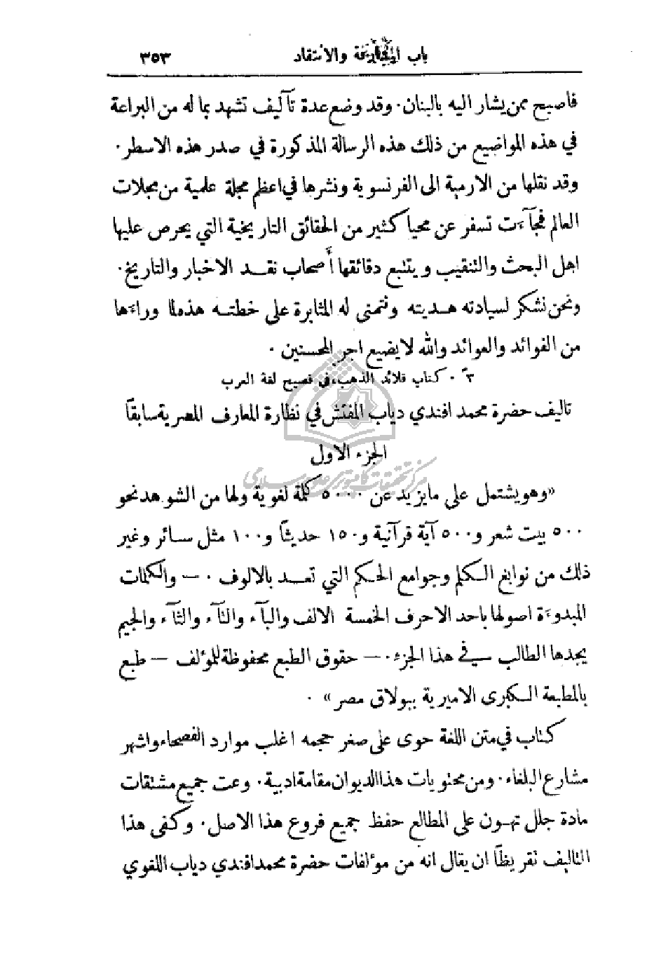 (وهو يشتمل على ما يزيد عن 5000 كلمة لغوية ولها من الشواهد نحو 500 بيت شعر و500 آية قرآنية و150 حديثاً و 100 مثل سائر وغير ذلك من نوابغ الكلم وجوامع الحكم التي تعد بالألوف. - والكلمات المبدوءة أصولها بأحد الأحرف الخمسة الألف والباء والتاء والثاء والجيم يجدها الطالب في هذا الجزءِ. - حقوق الطبع محفوظة للمؤلف - طبع بالمطبعة الكبرى الأميرية ببولاق مصر).