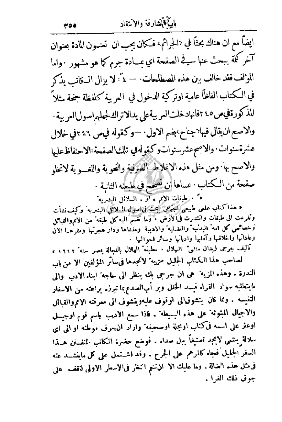 أيضاً مع أن هناك بحثاً في (الجرائم) فكان يجب أن تعنون المادة بعنوان آخر كلمة يبحث عنها في الصفحة أي بمادة جرم كما هو مشهور. وأما المؤلف فقد خالف بين هذه المصطلحات. 4: لا يزال الكاتب يذكر في الكتاب ألفاظاً عامية أو تركية الدخول في العربية كلفظة جنحة مثلاً المذكورة في ص 245 فأنها دخلت العربية على يد الأتراك لجهلهم أصول العربية. والأصح أن يقال فيها (جناح) بضم الأول. وكقوله في ص 246 في خلال عشر سنوات. والأصح عشر سنوات وكقوله في تلك الصفحة: الاحتفاظ عليها والأصح بها. ومن مثل هذه الأغلاط الصرفية والنحوية واللغوية لا تخلو صفحة من الكتاب. عساها أن تصحح في طبعته الثانية.