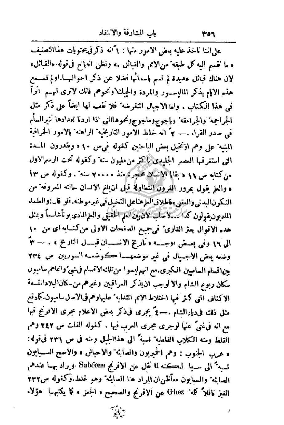 على أننا نأخذ عليه بعض الأمور منها: 1 - إنه ذكر في محتويات هذا التصنيف (ما تقسم إليه كل طبقة من الأمم والقبائل.) ونظن أنه بالغ في قوله (القبائل) لأن هناك قبائل عديدة لم تسم بأسمائها فضلا عن ذكر أحوالها. أو لم تسمع هذه الأيام بذكر الماليسور والمردة والجيك ونحوهم فأنك لا ترى لهم أثراً في هذا الكتاب. وأما الأجيال المنقرضة فلا تقف لها أيضاً على ذكر مثل الجراجمة والجرامقة وياجوج وماجوج ونحوها التي إذا أردنا تعدادها نثير السأم في صدر القراء. 2 - إنه خلط الأمور التاريخية الراهنة بالأمور الخرافية المبنية على وهم أو تخيل بعض الباحثين كقوله في ص 10 ويقدرون المدة التي استغرقها العصر الجليدي بأكثر من مليون سنة وكقوله تحت الرسم الأول من كتابه ص 11 بقايا الإنسان محجرة منذ 20000سنة. وكقوله ص 13 (والعلم يقول بمرور القرون المتطاولة قبل أن بلغ الإنسان حالته المعروفة من التكون البدني والعقلي) فإطلاق العلم هنا على التخيل في غير موطنه. فلو قال: والعلماء الماديون يقولون كذا. . . لأصاب لأن بين العلم الحقيقي والعلم المادي بوناً شاسعاً وبمثل هذه الأقوال يعثر القارئ في جميع الصفحات الأولى من كتابه أي من 10 إلى 16 وفي بعض اوجه (تاريخ الإنسان قبل التاريخ). 3 - وضعه بعض الأجيال في غير موضعها كوضعه السوريين ص 234 بين أقسام الساميين الكبرى. مع انهم ليسوا من تلك الأقسام في شيء وإنما هم ساميون سكان ربوع الشام وإلا لوجب أن يذكر العراقيين وغيرهم من سكان البلاد المتسعة الأكناف التي كثر فيها اختلاط الأمم المتغلبة عليها وهم في الأصل ساميون. كما وقع مثل ذلك في ديار الشام. 4 - يجري في ذكر بعض الأعلام مجرى الإفرنج فيها مع أنه في غنى عنها لو جرى مجرى العرب فيها. كقوله القلت ص 242 وهم القلط ومنه الكلاب القلطية نسبةً إلى هذا الجيل ومنه في ص 231 في قوله: (عرب الجنوب: وهم الحميريون والصابئة والأحباش) والأصح السبايون نسبةً إلى سبا لكنه لما نقل عن الإفرنج ويراد بها عندهم الصابئة والسبايون معاً ظن أن المراد هنا الصابئة وهو غلط. وكقوله ص 232 الغير ناقلاً كلمة عن الإفرنج والصحيح (الجعز) كما يكتبها هؤلاء
