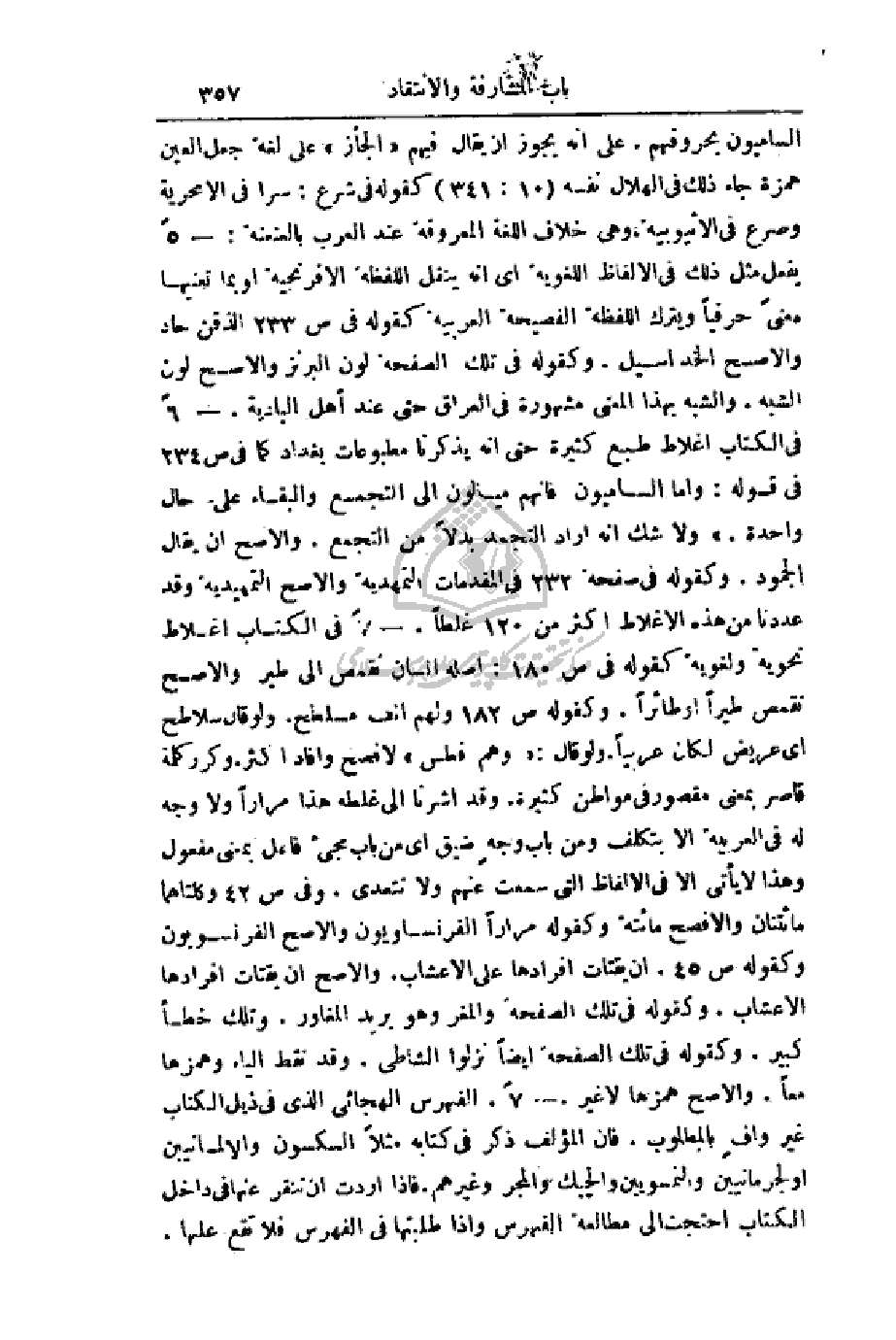 سرا في الامحرية وصرع في الأثيوبية. وهي خلاف اللغة المعروفة عند العرب بالعنعنة: 5 - يفعل مثل ذلك في الألفاظ اللغوية أي أنه ينقل اللفظة الإفرنجية أو بما تعنيها معنىً حرفياً ويترك اللفظة الفصيحة العربية كقوله في ص 233 الذقن حاد والأصح الخد أسيل. وكقوله في تلك الصفحة لون البرنز والأصح لون الشبه. والشبه بهذا المعنى مشهورة في العراق حتى عند أهل البادية. 6 - في الكتاب أغلاط طبع كثيرة حتى أنه يذكرنا مطبوعات بغداد كما في ص 234 في قوله: وأما الساميون فانهم ميالون إلى التجمع والبقاء على حال واحدة. ولا شك أنه أراد التجمد بدلاً من التجمع. والأصح أن يقال الجمود. وكقوله في صفحة 232 في المقدمات التمهيدية والأصح التمهيدية وقد عددنا من هذه الأغلاط اكثر من 120 غلطاً. 7 - في الكتاب أغلاط نحوية ولغوية كقوله في ص 180: اصله إنسان تقمص إلى طير والأصح تقمص طيراً أو طائراً. وكقوله ص 182 ولهم أنف مسلطح. ولو قال سلاطح أي عريض لكان عربياً. ولو قال: (وهم فطس) لأفصح وأفاد أكثر. وكرر كلمة قاصر بمعنى مقصور في مواطن كثيرة. وقد أشرنا إلى غلطه هذا مراراً ولا وجه له في العربية إلا بتكلف ومن باب وجهٍ ضيق أي من باب مجيء فاعل بمعنى مفعول وهذا لا يأتي إلا في الألفاظ التي سمعت عنهم ولا تتعدى. وفي ص 42 وكلتاهما مائتان والأفصح مائتة وكقوله مراراً الفرنساويون والأصح الفرنسويون وكقوله ص 45. إن يقتات أفرادها على الأعشاب. والأصح أن يقتات أفرادها على الأعشاب. وكقوله في تلك الصفحة والمغر وهو يريد المغاور. وتلك خطأ كبير. وكقوله في تلك الصفحة أيضاً نزلوا الشاطئ. وقد نقط الياء وهمزها معاً. والأصح همزها لا غير. 7 - الفهرس الهجائي الذي في ذيل الكتاب غير وافٍ بالمطلوب. فإن المؤلف ذكر في كتابه مثلاً السكسون والألمانيين أو الجرمانيين والنمسويين والجيك والمجر وغيرهم. فإذا أردت أن تنقر عنها في داخل الكتاب احتجت إلى مطالعة الفهرس وإذا طلبتها في الفهرس فلا تقع عليها.