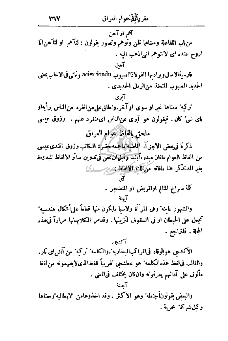 ذكرنا في بعض الأجزاء الماضية ما جمعه حضرة الكاتب رزوق أفندي عيسى من ألفاظ العوام ما كان مبدوءاً بالمد وقبل أن نمعن في تدوين سائر الألفاظ المبدوءة بغير المد نذكر ما فاته من تلك الألفاظ: