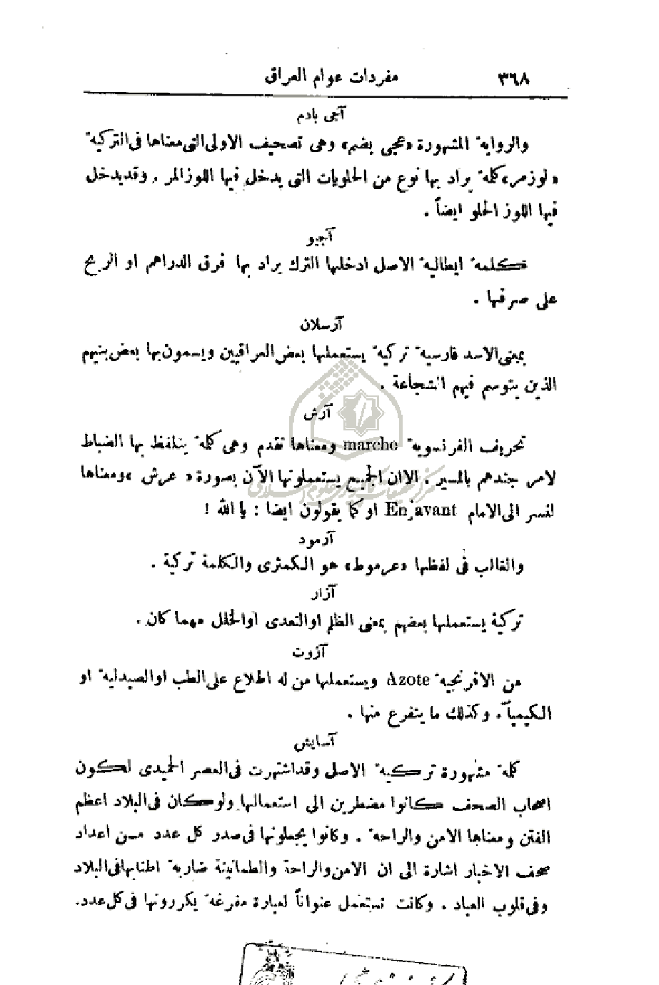 تحريف الفرنسوية ومعناها تقدم وهي كلمة يتلفظ بها الضباط لأمر جندهم بالمسير. إلا أن الجميع يستعملونها الآن بصورة (عرش) ومعناها لنسر إلى الأمام أو كما يقولون أيضا: يا لله!