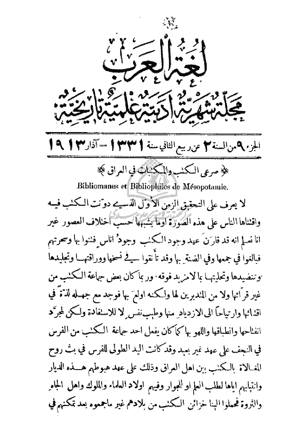 لا يعرف على التحقيق الزمن الأول الذي دوّنت الكتب فيه واقتناها الناس على هذه الصورة أو ما يشبهها حسب اختلاف العصور غير أنا نعلم أنه قد قارن عهد وجود الكتب وجودُ أناسٍ فتنوا بها وسحرتهم فبالغوا في جمعها وفي الضنة بها وقد تأنقوا في نسخها ووراقتها وتجليدها وتنضيدها وتحليتها بما لا مزيد فوقه. وربما كان بعض جماعة الكتب من غير قراّئها ولا من المتدبرين لها ولكنه أولع بها فوجد مع جهله لذّة في اقتنائها وارتياحاً إلى الازديادِ منها وطيب نفسِ لا للاستفادة ولكن لمجرَّد انفتاحها وانطباقها وللهو بها كما كان يفعل أحد جماعة الكتب من الفرس في النجف على عهد غير بعيد وقد كانت اليد الطولى للفرس في بث روح المغالاة بالكتب بين أهل العراق وذلك على عهد هبوطهم هذه الديار وانتيابهم إياها لطلب العلم أو للجوار وفيهم أولاد العلماء والملوك وأهل الجاهِ والثروة فحملوا إلينا خزائن الكتب من بلادهم غير ما جمعوه بعد تمكنهم في
