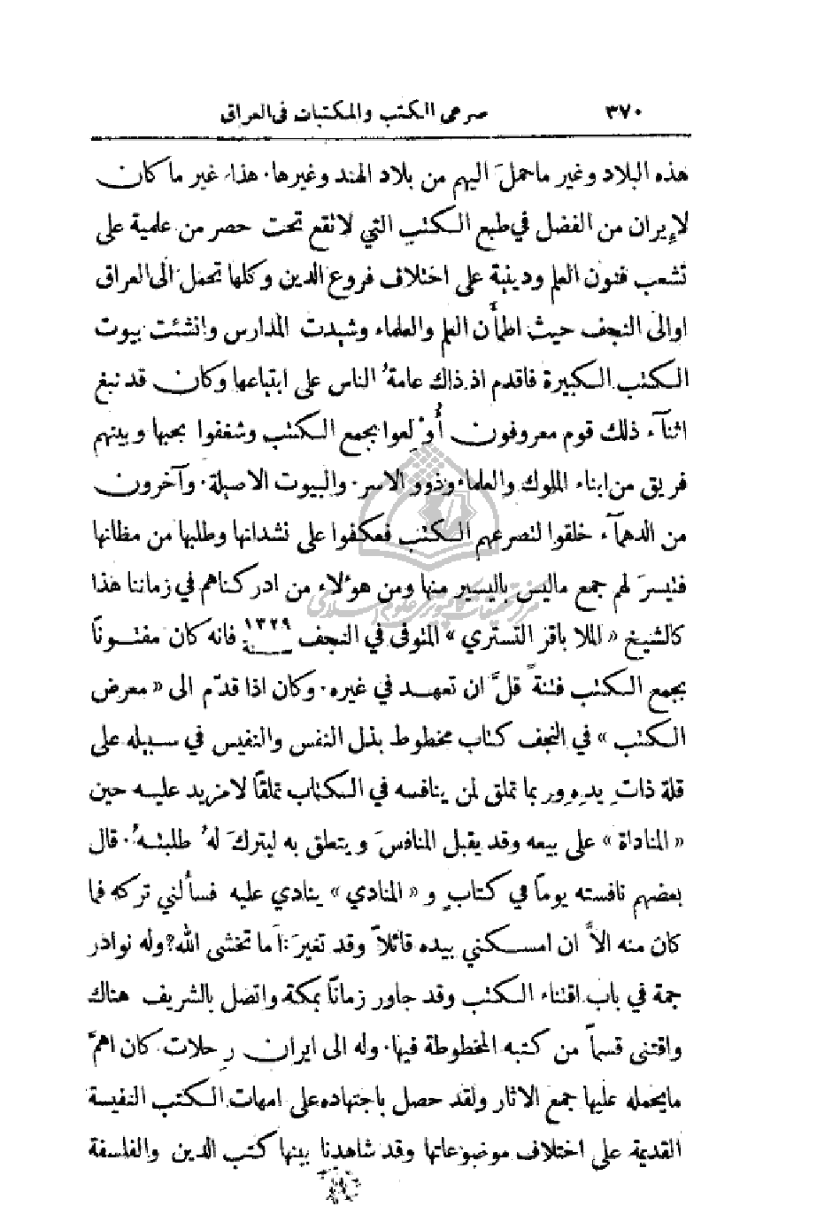 هذه البلاد وغير ما حملَ إليهم من بلاد الهند وغيرها. هذا غير ما كان لإِيران من الفضل في طبع الكتب التي لا تقع تحت حصر من علمية على تشعب فنون العلم ودينية على اختلاف فروع الدين وكلها تحمل إلى العراق أو إلى النجف حيث اطمأَن العلم والعلماء وشيدت المدارس وأنشئت بيوت الكتب الكبيرة فاقدم إذ ذاك عامةُ الناس على ابتياعها وكان قد نبغ أثناء ذلك قوم معروفون أُولِعوا بجمع الكتب وشغفوا بحبها وبينهم فريق من أبناء الملوك والعلماء وذوو الأسر. والبيوت الأصيلة. وآخرون من الدهماء خلقوا لتصرعهم الكتب فعكفوا على نشدانها وطلبها من مظانها فتيسرَ لهم جمع ما ليس باليسير منها ومن هؤلاء من أدرّكناهم في زماننا هذا كالشيخ (الملا باقر التستري) المتوفى في النجف سنة 1329 فأنه كان مفتوناً بجمع الكتب فتنةً قلَّ أن تعهد في غيره وكان إذا قدّم إلى (معرض الكتب) في النجف كتاب مخطوط بذل النفس والنفيس في سبيله على قلة ذات يِدِهِ وربما تملق لمن ينافسه في الكتاب تملقاً لا مزيد عليه حين (المناداة) على بيعه وقد يقبل المنافسَ ويتعلق به ليتركَ لهُ طلبتهُ. قال بعضهم نافسته يوماً في كتابٍ و (المنادي) ينادي عليه فسألني تركه فما كان منه إلاَّ أن امسكني بيده قائلاً وقد تغيرَ: أَما تخشى الله؟ وله نوادر جمة في باب اقتناء الكتب وقد جاور