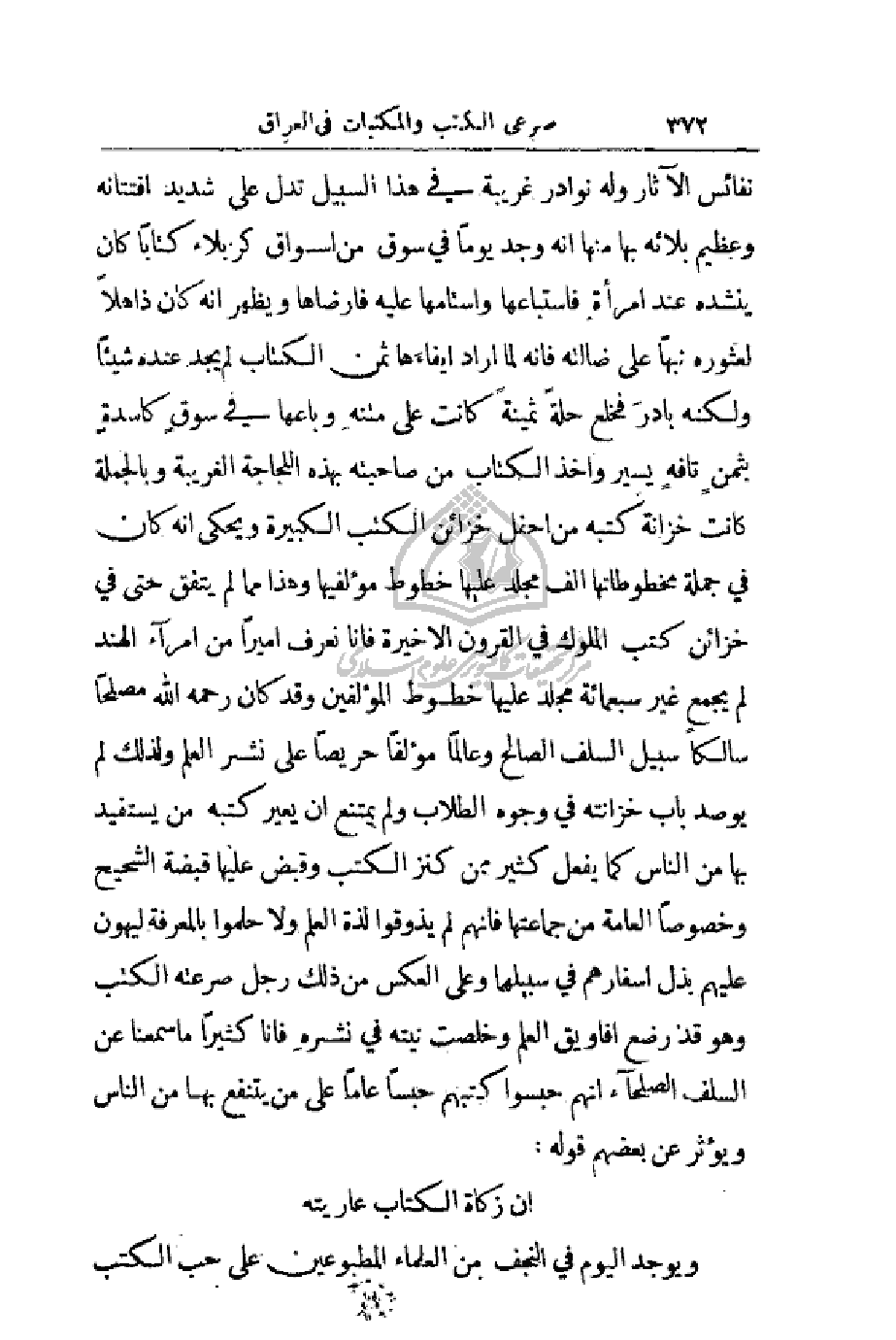 الملوك في القرون الأخيرة فأنا نعرف أميراً من أمراء الهند لم يجمع غير سبعمائة مجلد عليها خطوط المؤلفين وقد كان رحمه الله مصلحاً سالكاً سبيل السلف الصالح وعالماً مؤلفاً حريصاً على نشر العلم ولذلك لم يوصد باب خزانته في وجوه الطلاب ولم يمتنع أن يعير كتبه من يستفيد بها من الناس كما يفعل كثير ممن كنز الكتب وقبض عليها قبضة الشحيح وخصوصاً العامة من جماعتها فانهم لم يذوقوا لذة العلم ولا حملوا بالمعرفة ليهون عليهم بذل أسفارهم في سبيلهما وعلى العكس من ذلك رجل صرعته الكتب وهو قد رضع افاويق العلم وخلصت نيته في نشره فأنا كثيراً ما سمعنا عن السلف الصلحاء انهم حبسوا كتبهم حبساً عاماً على من ينتفع بها من الناس ويؤثر عن بعضهم قوله:
