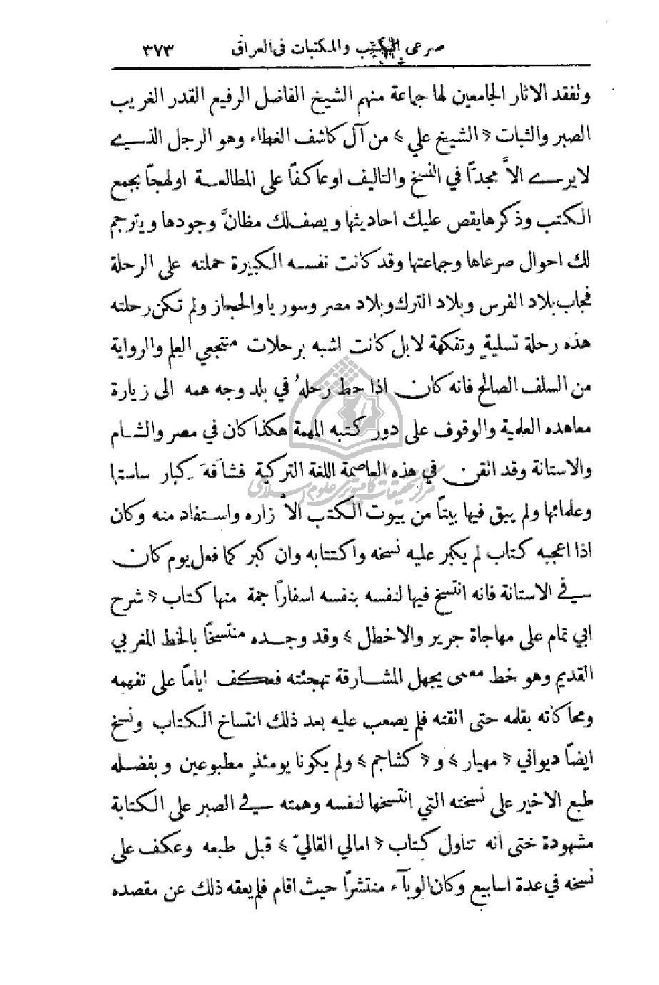 وتفقد الآثار الجامعين لها جماعة منهم الشيخ الفاضل الرفيع القدر الغريب الصبر والثبات (الشيخ علي) من آل كاشف الغطاء وهو الرجل الذي لا يرى إلاَّ مجدّاً في النسخ والتأليف أو عاكفاً على المطالعة أو لهجاً بجمع الكتب وذكرها يقص عليك أحاديثها ويصف لك مظانَّ وجودها ويترجم لك أحوال صرعاها وجماعتها وقد كانت نفسه الكبيرة حملته على الرحلة فجاب بلاد الفرس وبلاد الترك وبلاد مصر وسوريا والحجاز ولم تكن رحلته هذه رحلة تسلية وتفكهة لا بل كانت أشبه برحلات منتجعي العلم والرواية من السلف الصالح فأنه كان إذا حط رحلهُ في بلد وجه همه إلى زيارة معاهده العلمية والوقوف على دور كتبه المهمة هكذا كان في مصر والشام والأستانة وقد ألقن في هذه العاصمة اللغة التركية فشافه كبار ساستها وعلمائها ولم يبق فيها بيتاً من بيوت الكتب إلا زاره واستفاد منهُ وكان إذا أعجبه كتاب لم يكبر عليه نسخه واكتتابه وإن كبر كما فعل يوم كان في الأستانة فانه أنتسخ فيها لنفسه بنفسه أسفاراً جمة منها كتاب (شرح أبي تمام على مهاجاة جرير والأخطل) وقد وجده منتسخاً بالخط المغربي القديم وهو خط معمي يجهل المشارقة تهجئته فعكف أياماً على تفهمه ومحاكاته بقلمه حتى أتقنه فلم يصعب عليه بعد ذلك أنتساخ الكتاب ونسخ أيضاً ديواني (مهيار) و (كشاجم) ولم يكونا يومئذ مطبوعين وبفضله طبع الأخير على نسخته التي أنتسخها لنفسه وهمته في الصبر على الكتابة مشهودة حتى أنه تناول كتاب (آمالي