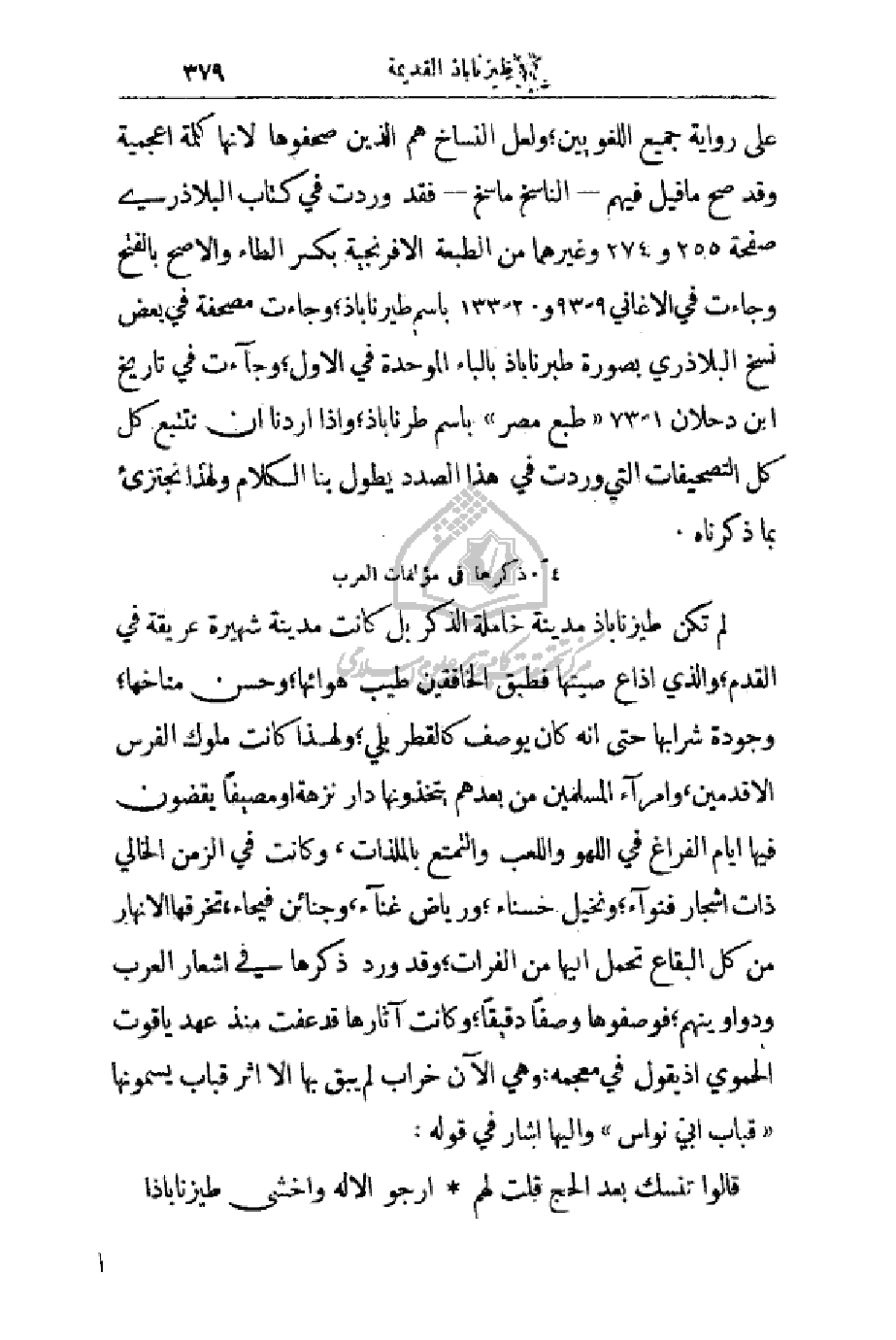 على رواية جميع اللغويين؛ ولعل النساخ هم الذين صحفوها لأنها كلمة أعجمية وقد صح ما قيل فيهم - الناسخ ماسخ - فقد وردت في كتاب البلاذري صفحة 255 و274 وغيرها من الطبعة الإفرنجية بكسر الطاء والأصح بالفتح وجاءت في الأغاني 9 - 93 و2 - 133 باسم طيرناباذ؛ وجاءت مصحفة في بعض نسخ البلاذري بصورة طبرناباذ بالباء الموحدة في الأول، وجاءت في تاريخ ابن دحلان 1 - 73 (طبع مصر) باسم طرناباذ؛ وإذا أردنا أن نتتبع كل التصحيفات التي وردت في هذا الصدد يطول بنا الكلام ولهذا نجتزئ بما ذكرناه.
