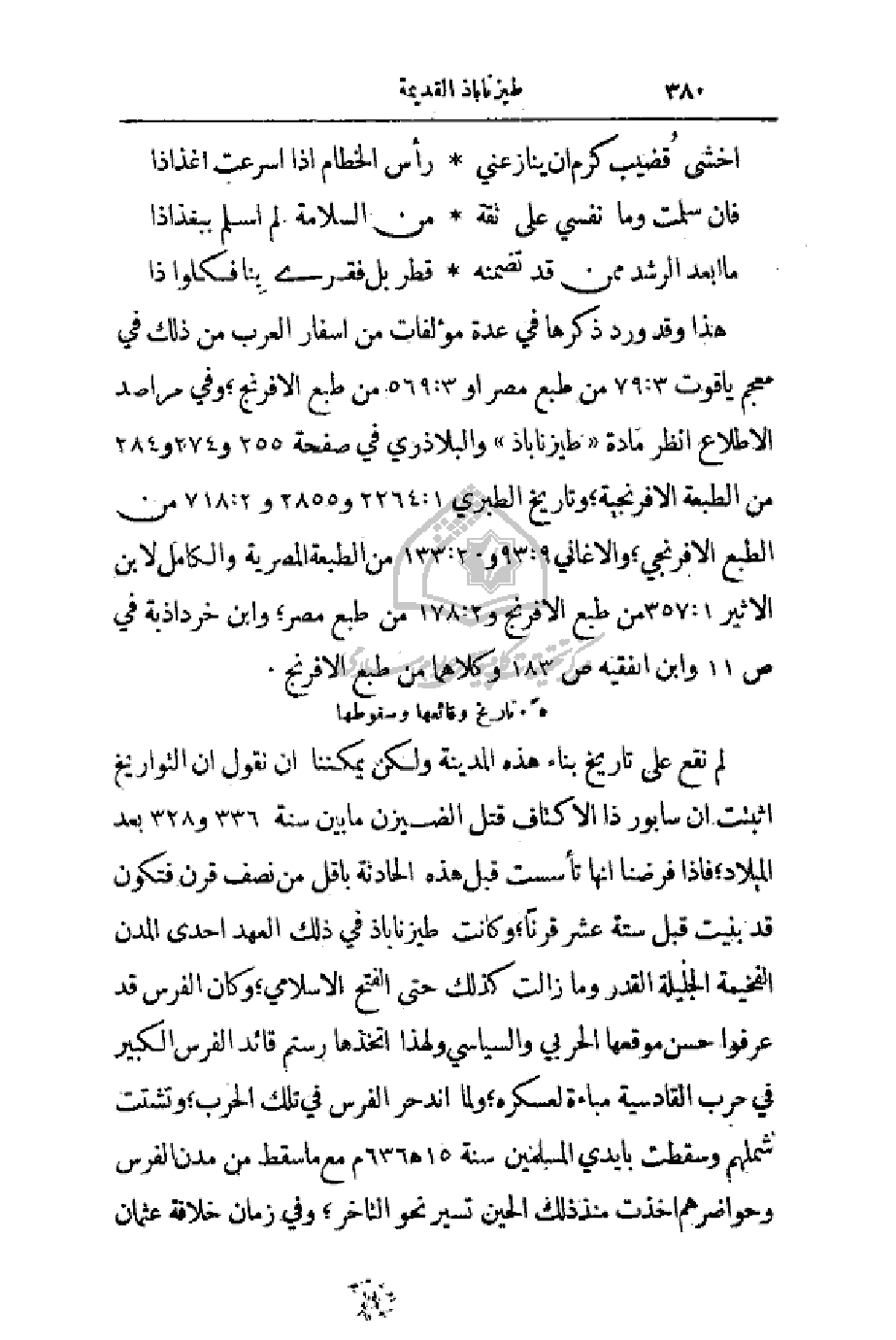 هذا وقد ورد ذكرها في عدة مؤلفات من أسفار العرب من ذلك في معجم ياقوت 79: 3 من طبع مصر أو 569: 3 من طبع الإفرنج؛ وفي مراصد الاطلاع انظر مادة (طيزناباذ) والبلاذري في صفحة 255 و274 و284 من الطبعة الإفرنجية؛ وتاريخ الطبري 2264: 1 و2855 و718: 2 من الطبع الإفرنجي؛ والأغاني 93: 9 و133: 2 من الطبعة المصرية والكامل لابن الأثير 357: 1 من طبع الإفرنج و178: 2 من طبع مصر؛ وابن خرداذبة في ص 11 وابن الفقيه ص 183 وكلاهما من طبع الإفرنج.