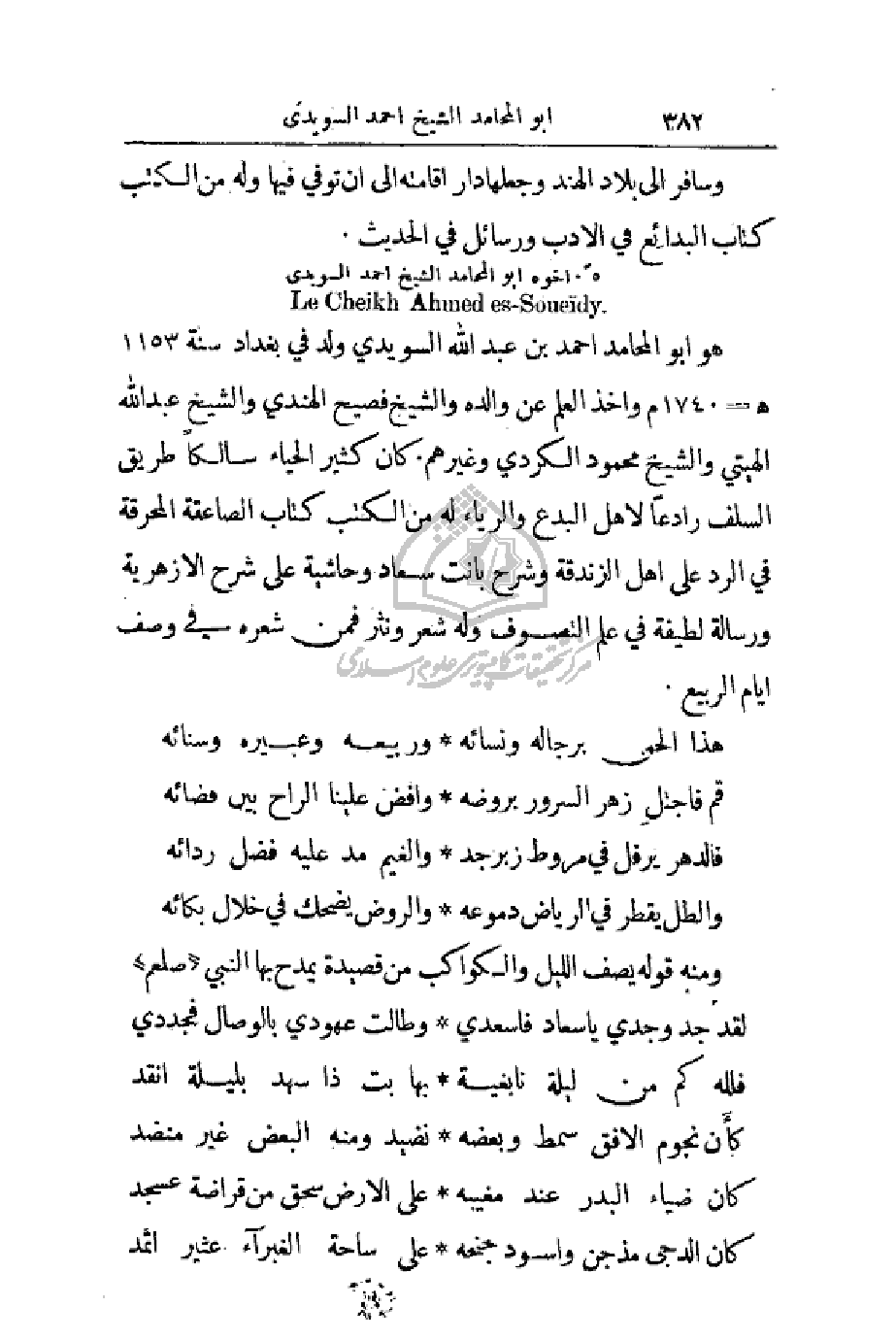 هو أبو المحامد احمد بن عبد الله السويدي ولد في بغداد سنة 1153هـ - 1740م واخذ العلم عن والده والشيخ فصيح الهندي والشيخ عبد الله الهيتي والشيخ محمود الكردي وغيرهم. كان كثير الحياء سالكاً طريق السلف رادعاً لأهل البدع والرياء له من الكتب كتاب الصاعقة المحرقة في الرد على أهل الزندقة وشرح بانت سعاد وحاشية على شرح الأزهرية ورسالة لطيفة في علم التصوف وله شعر ونثر فمن شعره في وصف أيام الربيع.
