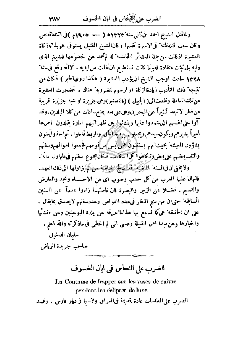 ولا يخفى أن في السنة الماضية قد عالج الغياصة من لم يزاولها إلى ذلك العهد. فانهال عليها العرب من كل حدب وصوب أي من الاحساء ونجد والعارض والقصيم. فضلا عن الزبير والبصرة فإن غاصتها زادوا عدداً عن السنين السابقة حتى أن من ينعم النظر في عدد الغواص وعدد سفنهم لا يصدق بما يقال. على أن الحقيقة هي كما تسمع بها هذا ما اعرفه عن بلدة البوعينين وعن منشئها وأخبارها وعن مبدأ أمر القبيلة وعسى أني لم أخطئ في ما ذكرته والله اعلم.