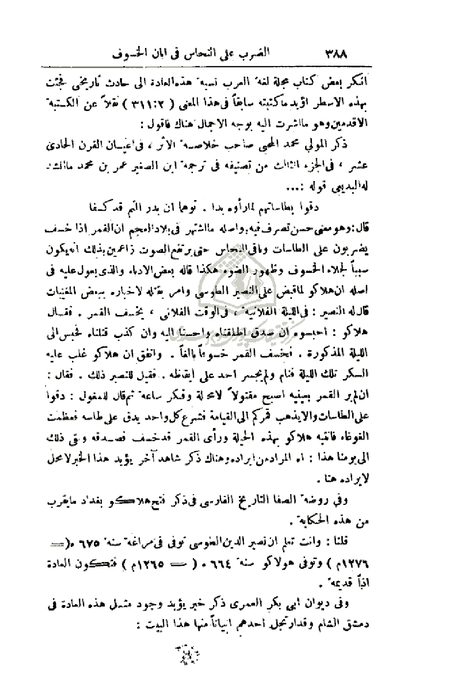 قال: وهو معنى حسن تصرف فيه واصله ما اشتهر في بلاد العجم أن القمر إذا خسف يضربون على الطاسات وباقي النحاس حتى يرتفع الصوت زاعمين بذلك أنه يكون سبباً لجلاء الخسوف وظهور الضوء هكذا قاله بعض الأدباء والذي يعول عليه في اصله أن هلاكو لما قبض على النصير الطوسي وأمر بقتله لأخباره ببعض المغيبات قال له النصير: في الليلة الفلانية، في الوقت الفلاني، يخسف القمر. فقال هلاكو: احبسوه إن صدق أطلقناه واحسنا إليه وإن كذب قتلناه فحبس إلى الليلة المذكورة. فخسف القمر خسوفا بالغاً. وأتفق أن هلاكو غلب عليه السكر تلك الليلة فنام ولم يجسر أحد على إيقاظه. فقيل للنصير ذلك. فقال: إن لم ير القمر بعينيه أصبح مقتولاً لا محالة وفكر ساعة ثم قال للمغول: دقوا على الطاسات وإلا يذهب قمركم إلى القيامة فشرع كل واحد يدق على طاسه فعظمت الغوغاء فانتبه هلاكو بهذه الحيلة ورأى القمر قد خسف فصدقه وبقي ذلك إلى يومنا هذا. المراد من إيراده وهناك ذكر شاهد آخر يؤيد هذا الخبر لا محل لإيراده هنا.