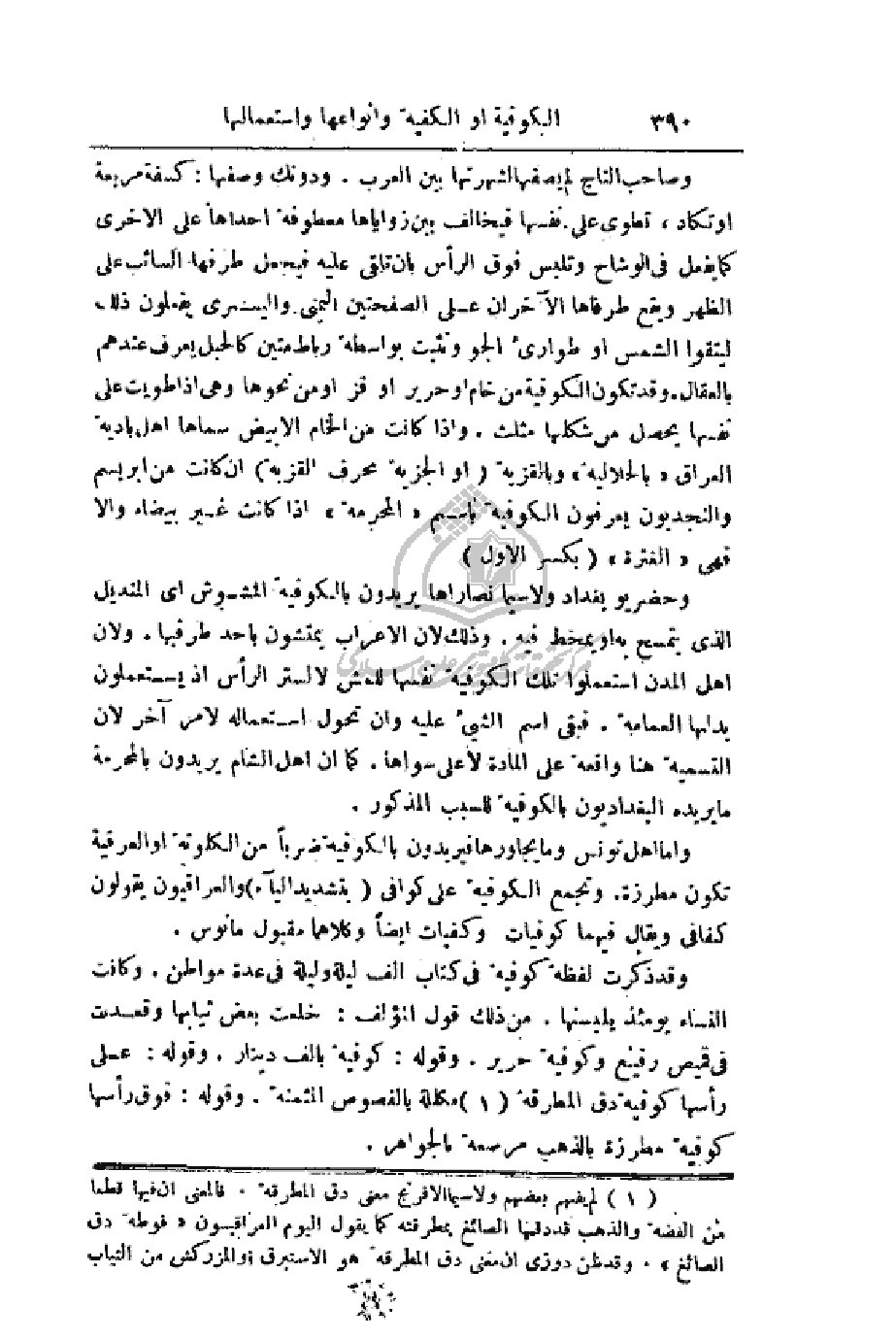 وأما أهل تونس وما يجاورها فيريدون بالكوفية ضرباً من الكلوتة أو العرقية تكون مطرزة: وتجمع الكوفية على كوافي (بتشديد الياء) والعراقيون يقولون كفافي ويقال فيهما كوفيات وكفيات أيضاً وكلاهما مقبول مأنوس.