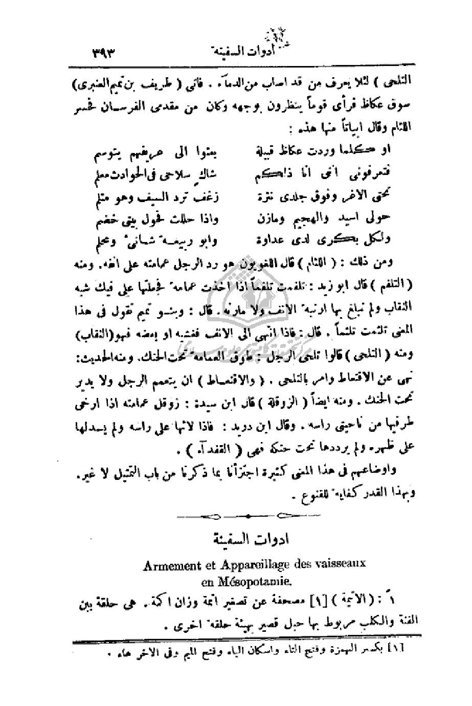 ومن ذلك: (اللثام) قال اللغويون هو رد الرجل عمامته على انفه ومنه (التلفم) قال أبو زيد: تلفمت تلفماً إذا أخذت عمامة فجعلتها على فيك شبه النقاب ولم تبلغ بها أرنبة الأنف ولا مارته. قال: وبنو تميم تقول في هذا المعنى تلثمت تلثماً. قال: فإذا انتهى إلى الأنف فغشيه أو بعضه فهو (النقاب) ومنه (التلحي) قالوا تلحى الرجل: طوق العمامة تحت الحنك. ومنه الحديث: نهى عن الاقتعاط وأمر بالتلحي. (والاقتعاط) أن يتعمم الرجل ولا يدير تحت الحنك. ومنه أيضاً (الزوقلة) قال ابن سيدة: زوقل عمامته إذا أرخى طرفيها من ناحيتي رأسه. وقال ابن دريد: فإذا لاثها على رأسه ولم يسدلها على ظهره ولم يرددها تحت حنكه فهي (القفدآء).