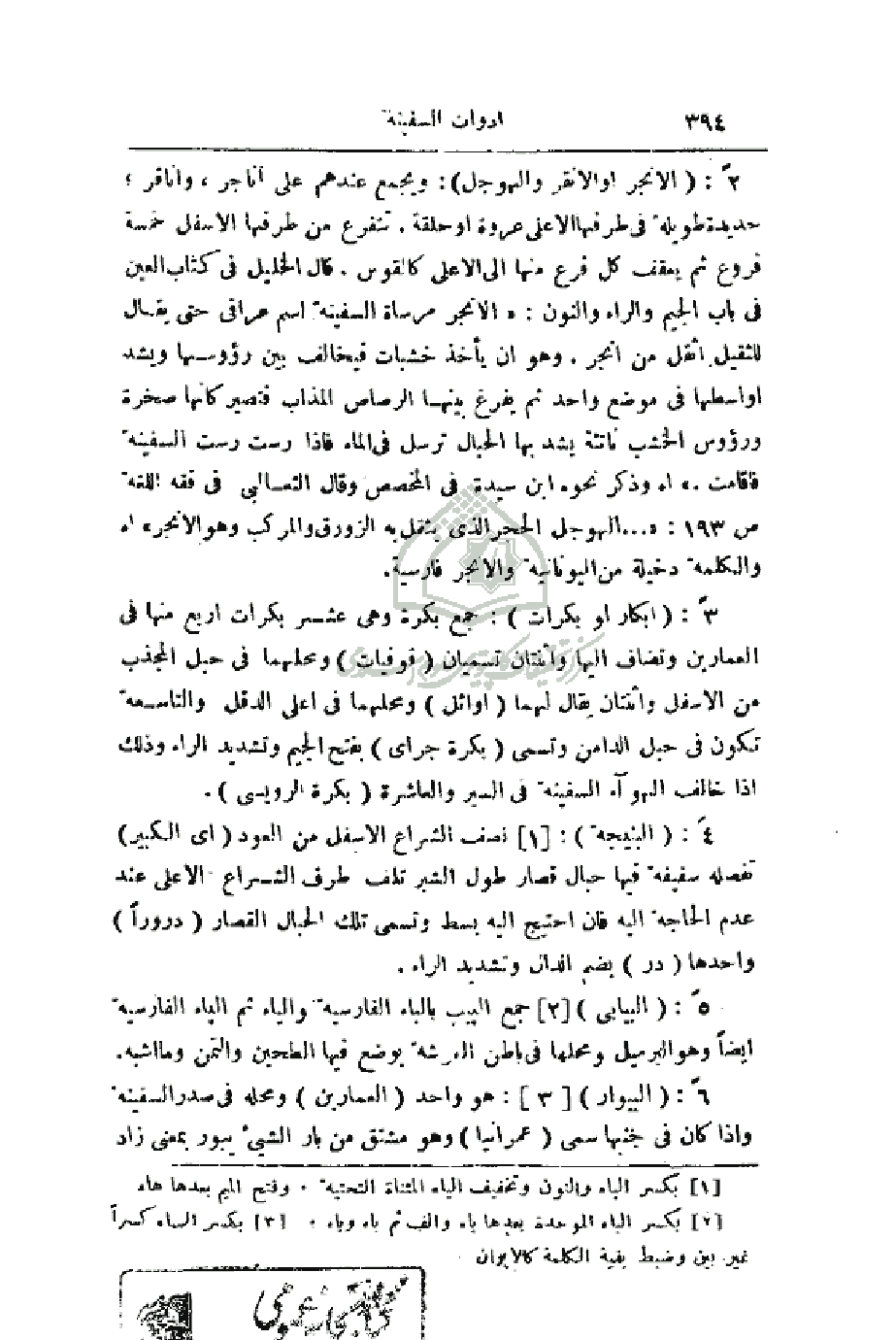 2 - (الانجر أو الانقر والهوجل): ويجمع عندهم على اناجر، واناقر؛ حديدة طويلة في طرفها الأعلى عروة أو حلقة. تتفرع من طرفها الأسفل خمسة فروع ثم يعقف كل فرع منها إلى الأعلى كالقوس. قال الخليل في كتاب العين في باب الجيم والراء والنون: (الانجر مرساة السفينة اسم عراقي حتى يقال للثقيل اثقل من انجر. وهو أن يأخذ خشبات فيخالف بين رؤوسها ويشد أواسطها في موضع واحد ثم يفرغ بينها الرصاص المذاب فتصير كأنها صخرة ورؤوس الخشب ناتئة يشد بها الحبال ترسل في الماء فإذا رست السفينة فأقامت. وذكر نحوه ابن سيدة في المخصص وقال الثعالبي في فقه اللغة ص 193: (. . . الهوجل الحجر الذي يثقل به الزورق والمركب وهو الانجر) والكلمة دخيلة من اليونانية والانجر فارسية.