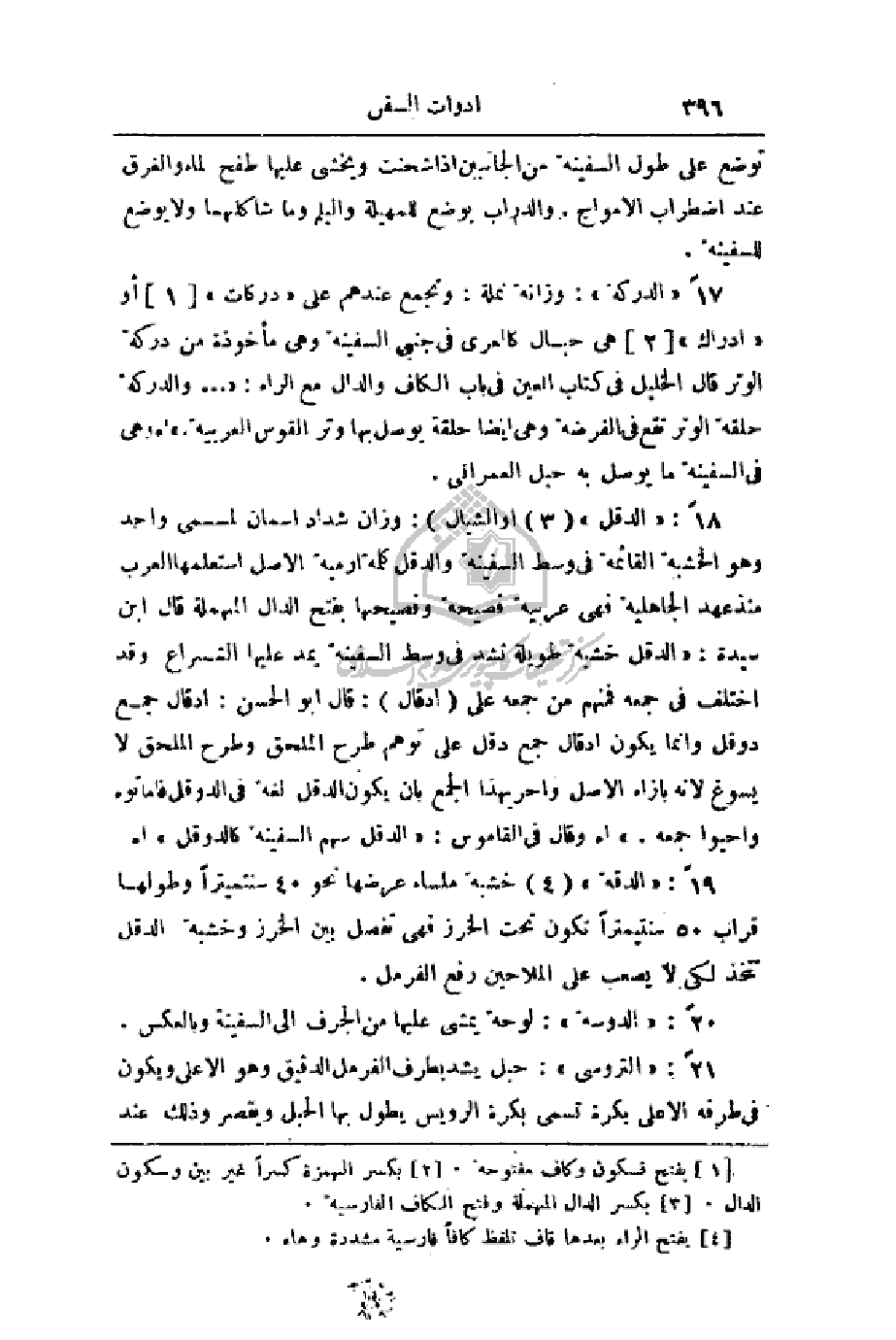 17 - (الدركة): وزانة نملة: وتجمع عندهم على (دركات) أو (ادراك) هي حبال كالعرى في جنبي السفينة وهي مأخوذة من دركة الوتر قال الخليل في كتاب العين في باب الكاف والدال مع الراء: (. . . والدركة حلقة الوتر تقع في الفرضة وهي أيضاً حلقة يوصل بها وتر القوس العربية.) وهي في السفينة ما يوصل به حبل العمراني.