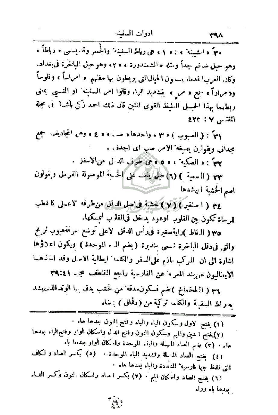 30 - إشبينة: هي رباط السفينة والجسر وقد يسمى (رباطاً) وهو حبل ضخم جداً ومثله (الشمندورة) وهو حبل الباخرة في بغداد. وكان العرب القدماء يسمون الحبال التي يربطون بها سفنهم (امراساً) وقلوساً و (مراراً) جمع (مرِ) بتشديد الراء وقالوا أمر السفينة أو الشيء بمعنى ربطهما بهذا الحبل الغليظ المتين قال ذلك احمد زكي باشا في مجلة المقتبس 423: 7