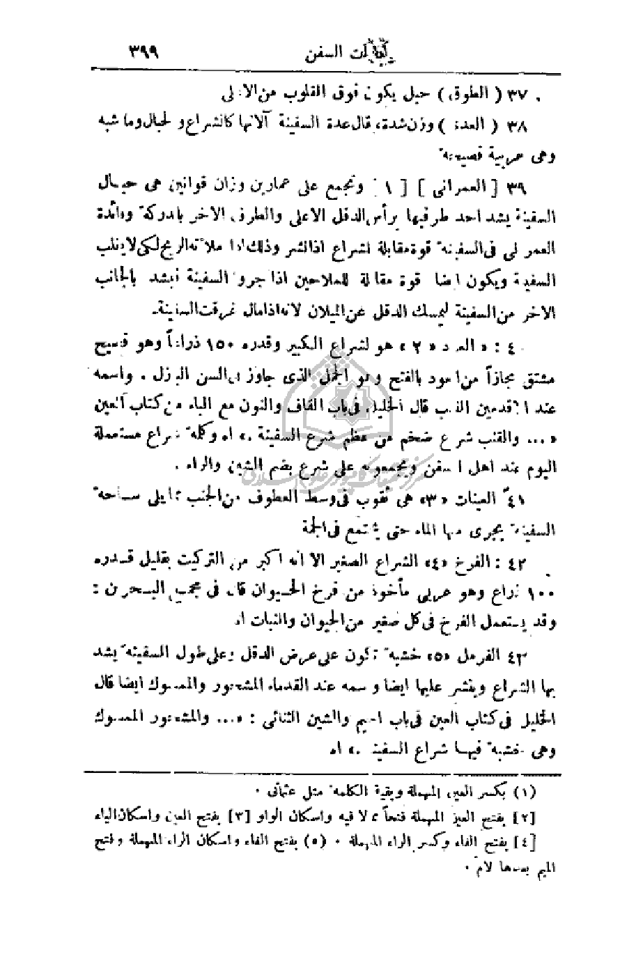 40 - (العود) هو الشراع الكبير وقدره 150 ذراعاً وهو فصيح مشتق مجازاً من العود بالفتح وهو الجمل الذي جاوز في السن البازل. واسمه عند الأقدمين ألقب قال الخليل في باب القاف والنون مع الباء من كتاب العين (. . . والقنب شرع ضخم من عظم شرع السفينة) وكلمة شراع مستعملة اليوم عند أهل السفن ويجمعونه على شرع بضم الشين والراء.