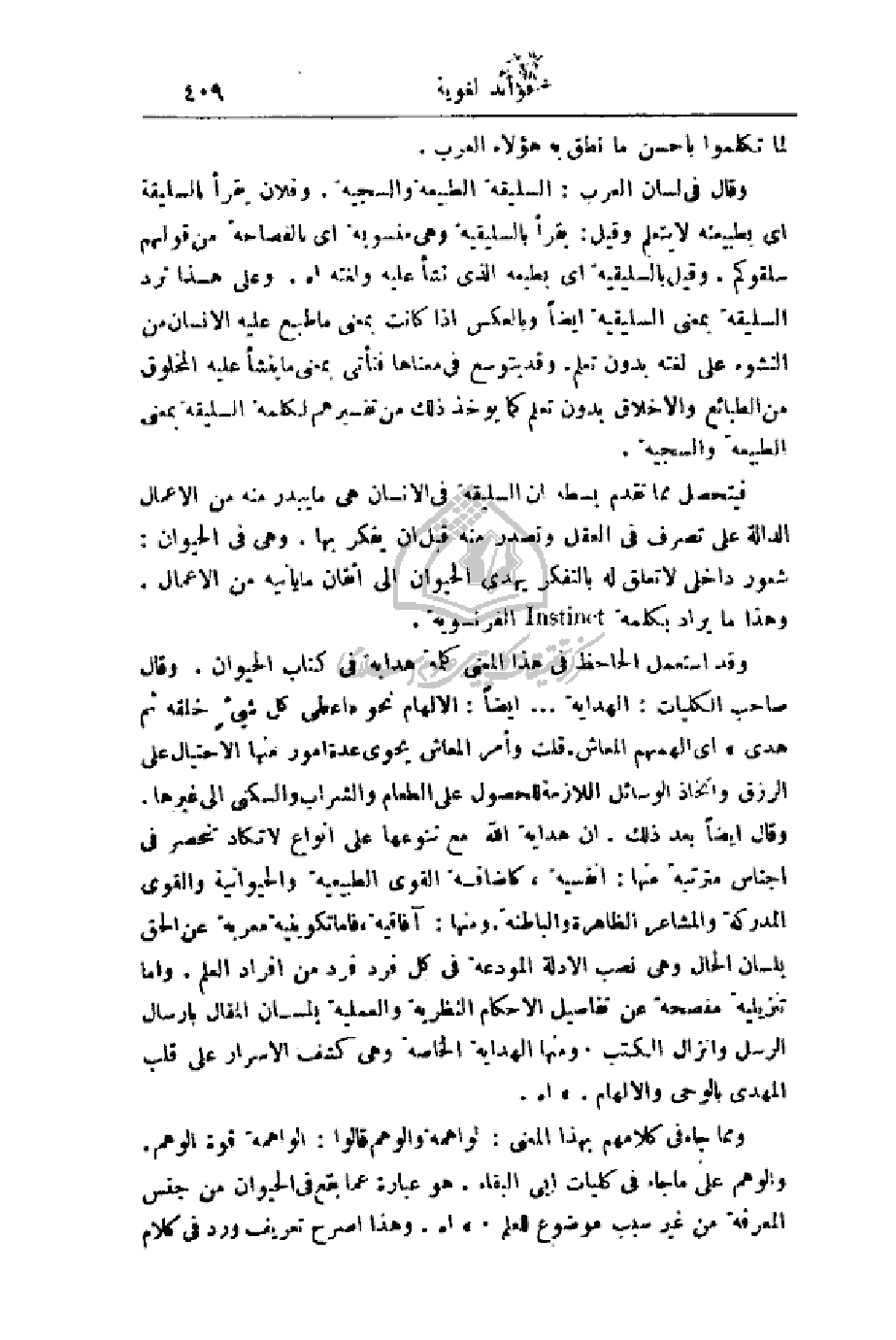 وقد استعمل الجاحظ في هذا المعنى كلمة هداية في كتاب الحيوان. وقال صاحب الكليات: الهداية. . . أيضاً: الإلهام نحو (أعطى كل شيءٍ خلقه ثم هدى) أي ألهمهم المعاش. قلت وأمر المعاش يحوي عدة أمور منها الاحتيال على الرزق واتخاذ الوسائل اللازمة للحصول على الطعام والشراب والسكنى إلى غيرها. وقال أيضاً بعد ذلك. إن هداية الله مع تنوعها على أنواع لا تكاد تنحصر في أجناس مترتبة منها: انفسية، كإضافة القوى الطبيعية والحيوانية والقوى المدركة والمشاعر الظاهرة والباطنة ومنها: آفاقية، فأما تكوينية معربة عن الحق بلسان الحال وهي نصب الأدلة المودعة في كل فرد فرد من أفراد العلم. وأما تنزيلية مفصحة عن تفاصيل الأحكام النظرية والعملية بلسان المقال بإرسال الرسل وإنزال الكتب. ومنها الهداية الخاصة وهي كشف الأسرار على قلب المهدي بالوحي والإلهام.