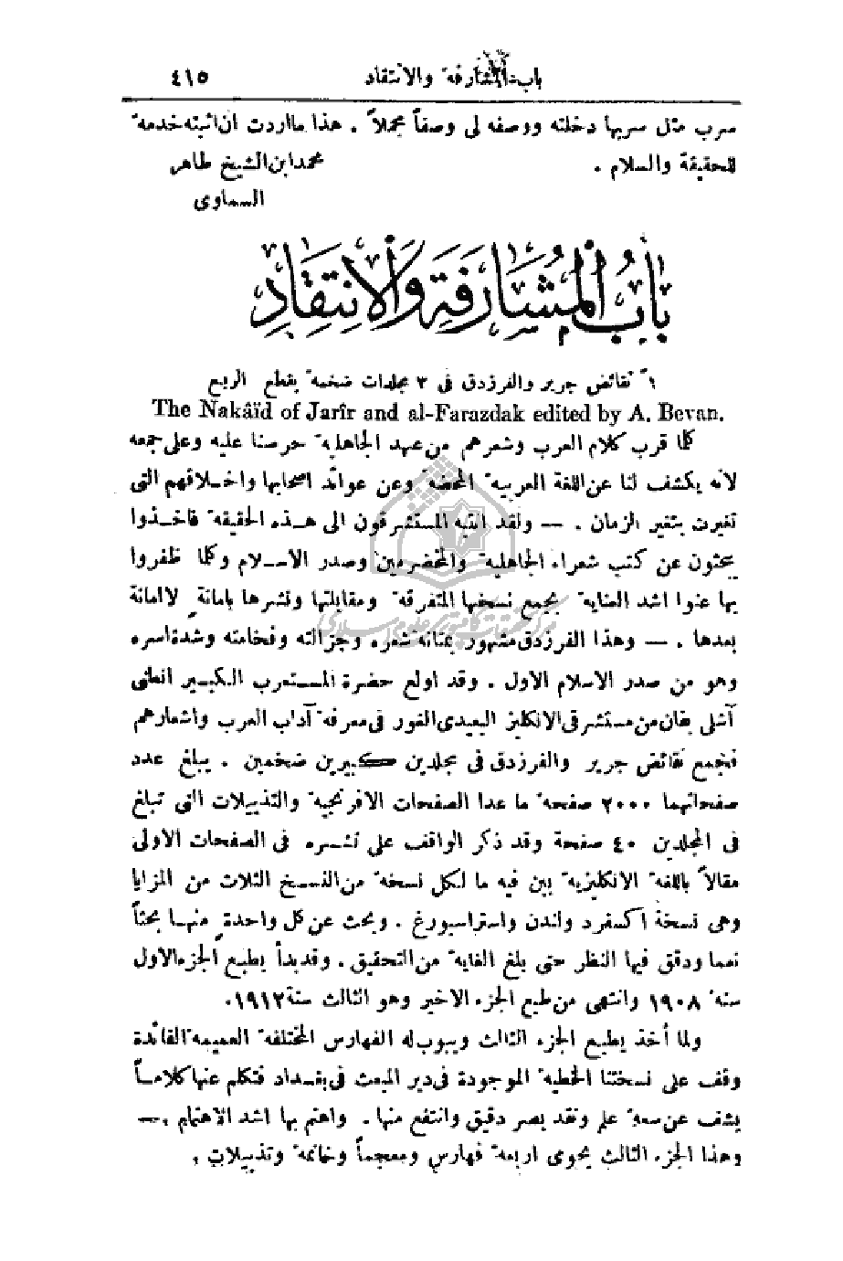 كلما قرب كلام العرب وشعرهم من عهد الجاهلية حرصنا عليه وعلى جمعه لأنه يكشف لنا عن اللغة العربية المحضة وعن عوائد أصحابها وأخلاقهم التي تغيرت بتغير الزمان. - ولقد انتبه المستشرقون إلى هذه الحقيقة فاخذوا يبحثون عن كتب شعراء الجاهلية والمخضرمين وصدر الإسلام وكلما ظفروا بها عنوا اشد العناية بجمع نسخها المتفرقة ومقابلتها ونشرها بأمانة لا أمانة بعدها. وهذا الفرزدق مشهور بمتانة شعره وجزالته وفخامته وشدة آسره وهو من صدر الإسلام الأول. وقد اولع حضرة المستعرب الكبير الظي آشلي بفان من مستشرقي الإنكليز البعيدي الغور في معرفة آداب العرب وأشعارهم فجمع نقائض جرير والفرزدق في مجلدين كبيرين ضخمين. يبلغ عدد صفحاتهما 2000 صفحة ما عدا الصفحات الإفرنجية والتذييلات التي تبلغ في المجلدين 40 صفحة وقد ذكر الواقف على نشره في الصفحات الأولى مقالاً باللغة الإنكليزية بين فيه ما لكل نسخة من النسخ الثلاث من المزايا وهي نسخة اكسفرد ولندن واستراسبورغ. وبحث عن كل واحدةٍ منها بحثاُ نعما ودقق فيها النظر حتى بلغ من التحقيق. وقد بدأ بطبع الجزء الأول سنة 1908 وانتهى من طبع الجزء الأخير وهو الثالث سنة 1912.