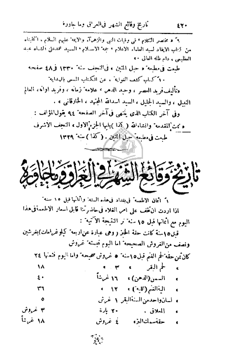 1 - أثمان الأطعمة في بغداد في هذه السنة وأثمانها قبل 15
