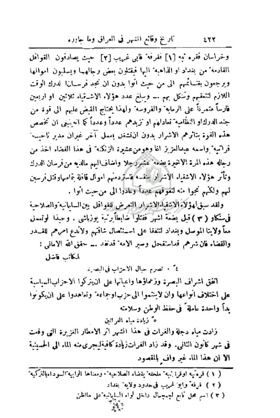 وخراسان فقره تبه فأبي غريب حيث يصادفون القوافل القادمة من بغداد أو الذاهبة إليها فيقتلون بعض رجالها ويسلبون أموالها ويرجعون بغنائمهم إلى من حيث أتوا بدون أن تجد فرسان لدرك الوقت اللازم لتعقبهم وتنكل بهم. - ويبلغ عدد هؤلاء الأشقياء ثلاثين أو أربعين فارساً متمرناً على الرماية والفروسية ولهذا يحتاج القبض عليهم إلى قوة من جند الدرك أو النظامية تعادلهم أو تزيدهم عدداً وعدداً كما انه ينبغي أن تخصص هذه القوة بتأثرهم الأشرار بدون أن تشغل بعمل آخر غير أن مدير ناحية قراتبة واسمه عبد العزيز آغا وهو من عشيرة الزنكنة في هذا القضاء اخذ من رجاله هذه المرة الأخيرة بضعة عشر رجلا وأضاف إليهم ما لديه من فرسان الدرك وتأثر هؤلاء الأشقياء الأشرار بنفسه فاسترد منهم أموال قافلة بتماهها وقتل فرسين لهم ولكنهم نجوا منه لتفوقهم عدداً وعادوا إلى من حيث آتو.