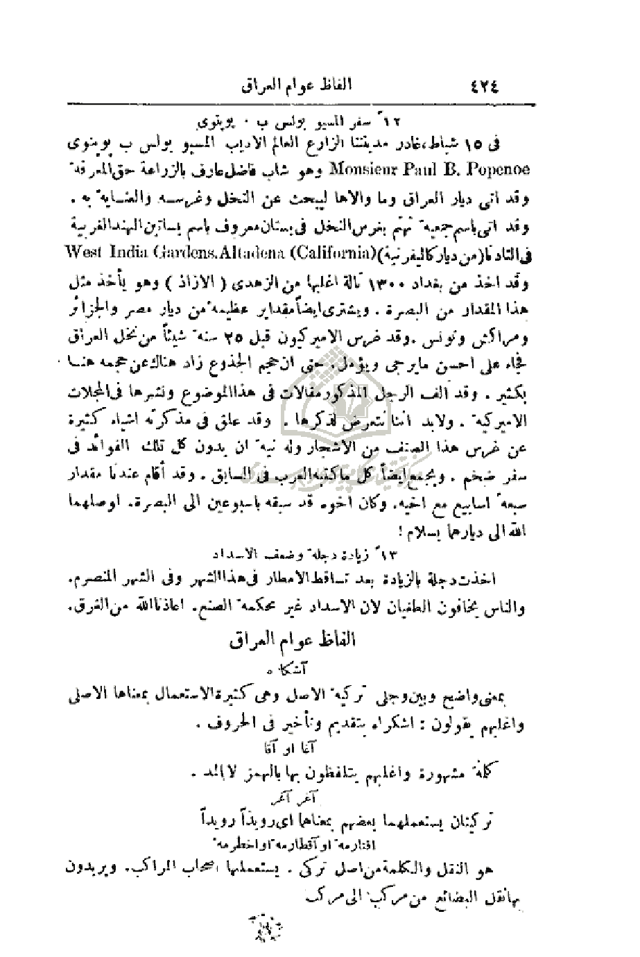 في 15 شباط غادر مدينتنا الزارع العالم الأديب المسيو بولس ب يوينوي وهو شاب فاضل عارف بالزراعة حق المعرفة وقد أتى ديار العراق وما والاها ليبحث عن النخل وغرسه والعناية به. وقد أتى باسم جمعية تهتم بغرس النخل في بستان معروف باسم بساتين الهند الغربية في التادنا (من ديار كاليفرنية) وقد اخذ من بغداد 1300 تالة اغلبها من الزهدي (الازاذ) وهو يأخذ مثل هذا المقدار من البصرة. ويشتري أيضاً مقادير عظيمة من ديار مصر والجزائر مراكش وتونس. وقد غرس الأميركيون قبل 25 سنة شيئاً من نخل العراق فجاء على احسن ما يرجى ويؤمل. حتى أن حجم الجذوع زاد هناك عن حجمه هنا بكثير. وقد ألف الرجل المذكور مقالات في هذا الموضوع ونشرها في المجلات الأميركية. ولابد أننا نتعرض لذكرها. وقد علق في مذكرته أشياء كثيرة عن غرس هذا الصنف من الأشجار وله نية أن يدون كل تلك الفوائد في سفر ضخم. ويجمع أيضاً كل ما كتبه العرب في السابق. وقد أقام عندنا مقدار سبعة أسابيع مع أخيه. وكان أخوه قد سبقه