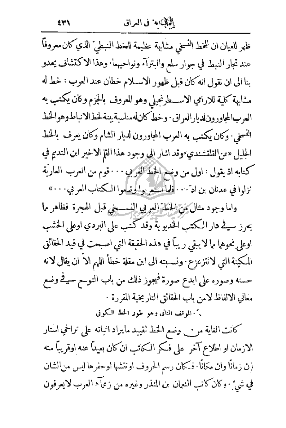وأما وجود مثال من الخط العربي النسخي قبل الهجرة فظاهر مما يحرز في دار الكتب الخديوية وقد كتب على البردي أو على الخشب أو على نحوهما مما لا يبقي ريباً في هذه الحقيقة التي أصبحت في قيد الحقائق المكينة التي لا تتزعزع. ونسبته إلى ابن مقلة خطأ اللهم ألاّ أن يقال لأنه حسنه وصوره على أبدع صورة فيجوز ذلك من باب التوسع في وضع معاني الألفاظ لا من باب الحقائق التاريخية المقررة.