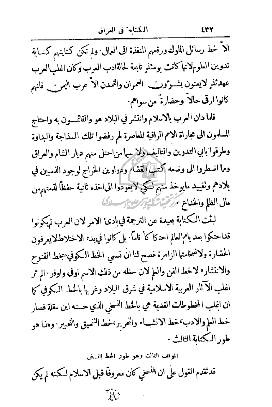 لبثت الكتابة بعيدة عن الترجمة في بادئ الأمر لأن العرب لم يكونوا قد احتكوا بعد بأمم العالم احتكاكاً تاماً. بل كانوا في بدءِ الاختلاط لا يعرفون الحضارة ولا ضخامتها الزاهرة فصح لنا أن نسمي الخط الكوفي (بخط الفتوح والانتشار) لا خط الفن والعلم لأن حظه من ذلك الاسم أوفى وأوفر. ألم تزل اغلب الآثار العربية الإسلامية في شرق البلاد وغربها بالخط الكوفي كما أن اغلب المخطوطات القديمة هي بالخط النسخي الذي حسنه ابن مقلة فصار خط العلم والأدب، خط الإنشاء والتحرير، خط التنميق والتحبير. وهذا هو طور الكتابة الثالث.