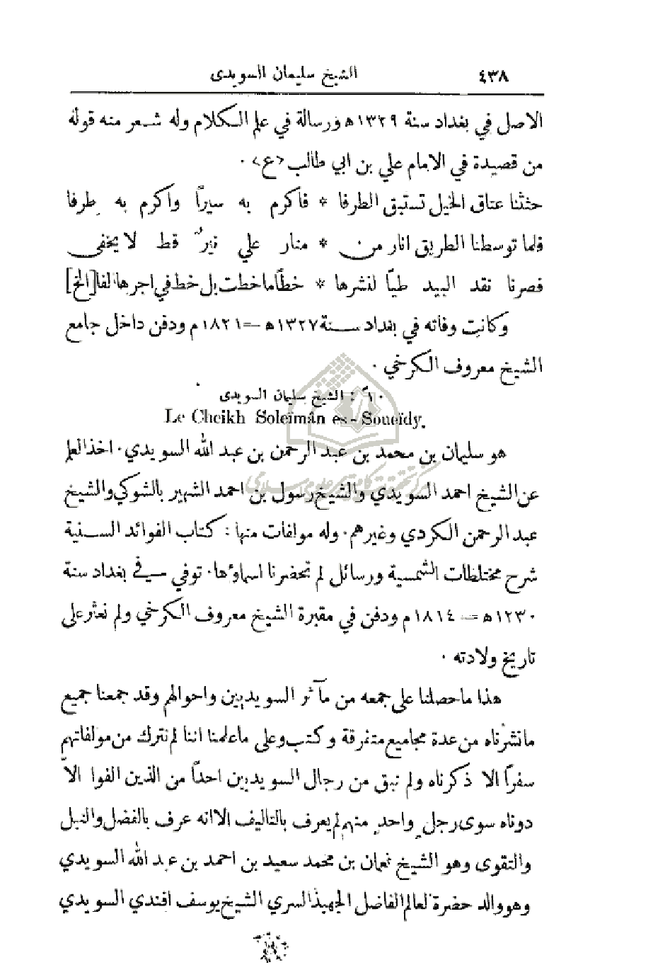 هو سليمان بن محمد بن عبد الرحمن بن عبد الله السويدي. اخذ العلم عن الشيخ احمد السويدي والشيخ رسول بن احمد الشهير بالشوكي والشيخ عبد الرحمن الكردي وغيرهم. وله مؤلفات منها: كتاب الفوائد السنية شرح مختلطات الشمسية ورسائل لم تحضرنا أسماؤها. توفي في بغداد سنة 1230هـ - 1814م ودفن في مقبرة الشيخ معروف الكرخي ولم نعثر على تاريخ ولادته.