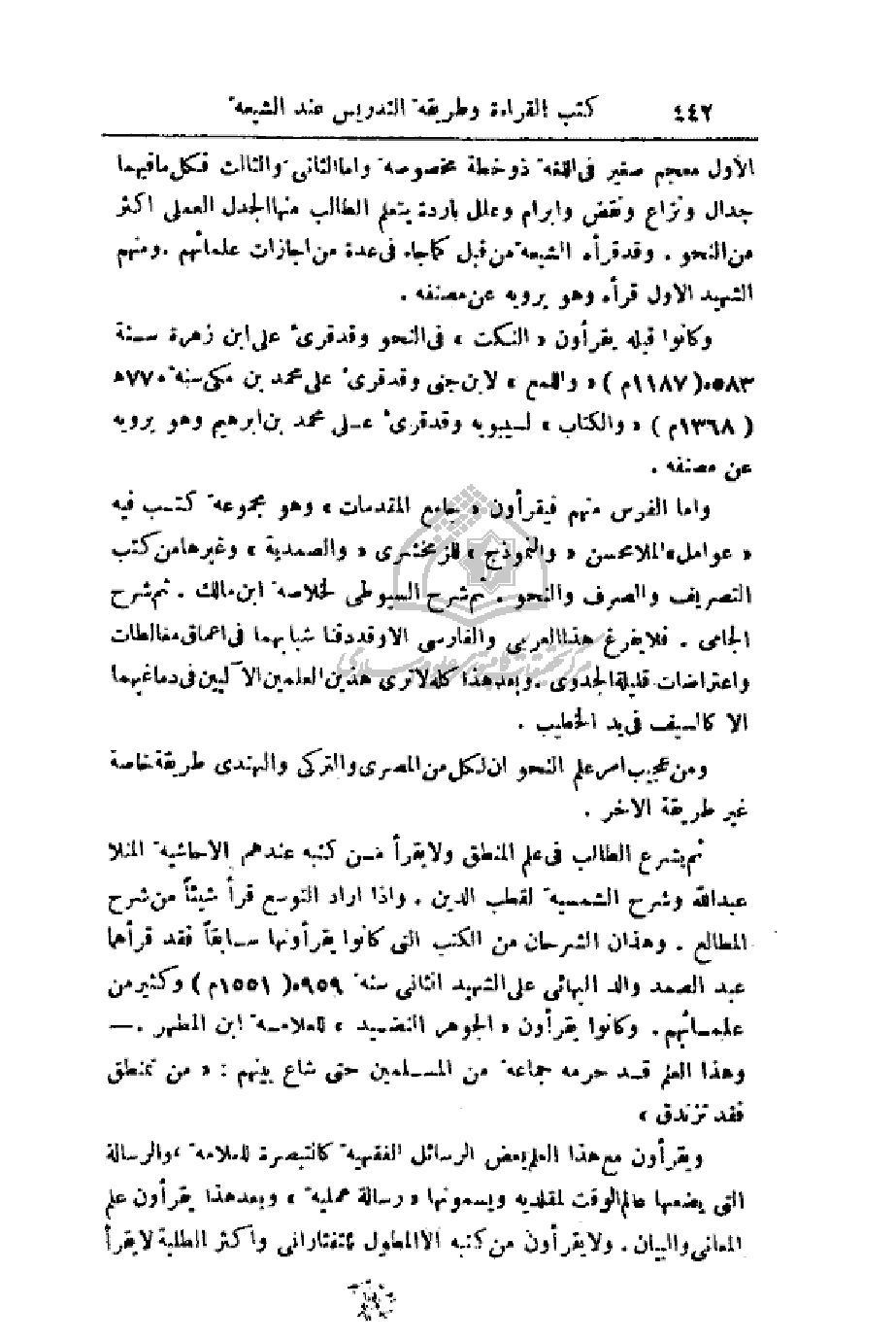ثم يشرع الطالب في علم المنطق ولا يقرأ من كتبه عندهم إلا حاشية الملا عبد الله وشرح الشمسية لقطب الدين. وإذا أراد التوسع قرأ شيئاً من شرح المطالع. وهذان الشرحان من الكتب التي كانوا يقرءونها سابقاً فقد قرأهما عبد الصمد والد البهائي على الشهيد الثاني سنة 959هـ (1551م) وكثير من علمائهم. وكانوا يقرءون (الجوهر النضيد) للعلامة ابن المطهر. - وهذا العلم قد حرمه جماعة من المسلمين حتى شاع بينهم: (من تمنطق فقد