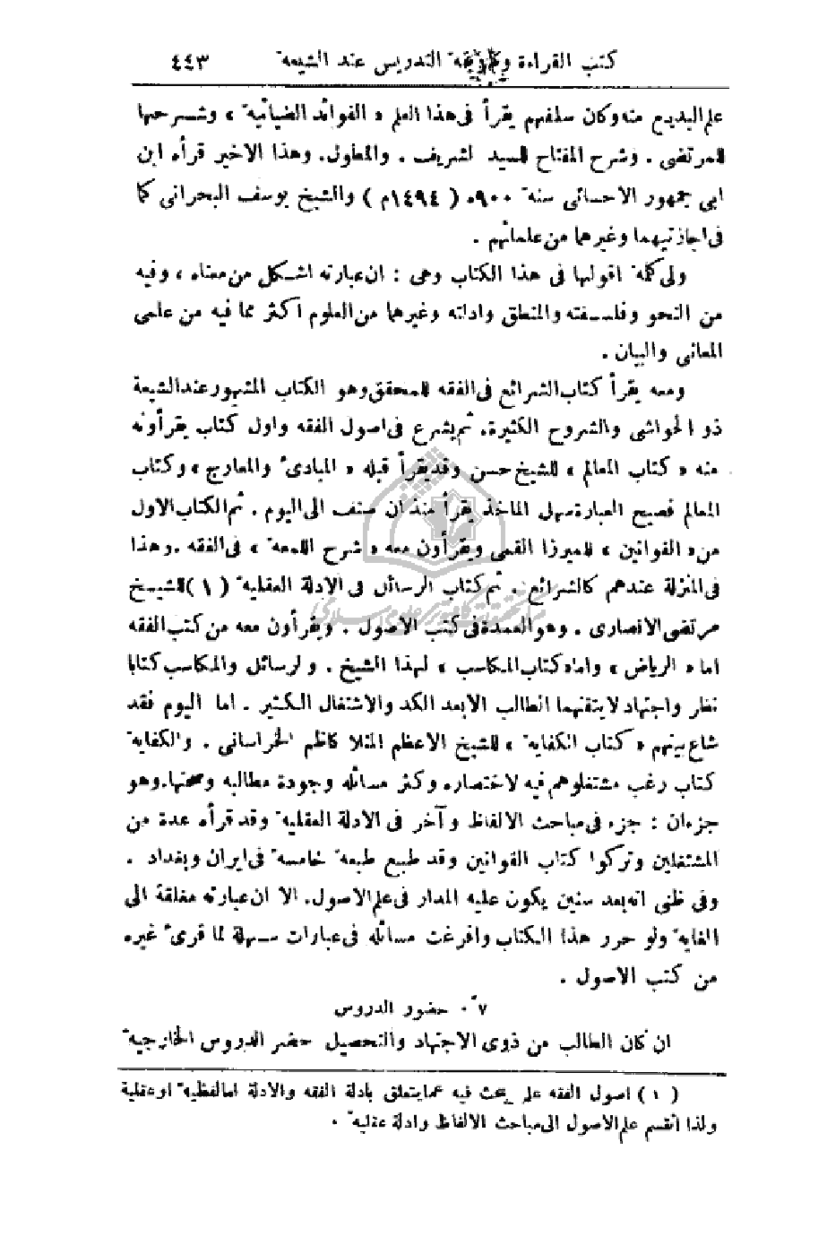 ومعه يقرأ كتاب الشرائع في الفقه للمحقق وهو الكتاب المشهور عند الشيعة ذو الحواشي والشروح الكثيرة. ثم يشرع في أصول الفقه وأول كتاب يقرءونه منه (كتاب المعالم) للشيخ حسن وقد يقرأ قبله (المبادئ والمعارج) وكتاب المعالم فصيح العبارة سهل المأخذ يقرأ منذ أن صنف إلى اليوم. ثم الكتاب الأول من (القوانين) للميرزا القمي ويقرءون معه (شرح اللمعة) في الفقه. وهذا في المنزلة عندهم كالشرائع. ثم كتاب الرسائل في الأدلة العقلية للشيخ مرتضى الأنصاري. وهو العمدة في كتب الأصول. ويقرءون معه من كتب الفقه أما (الرياض) وأما (كتاب المكاسب) لهذا الشيخ. والرسائل والمكاسب كتابا نظر واجتهاد لا يتقنهما الطالب إلا بعد الكد والاشتغال الكثير. أما اليوم فقد شاع بينهم (كتاب الكفاية) للشيخ الأعظم الملا كاظم الخراساني. والكفاية كتاب رغب مشتغلوهم فيه لاختصاره وكثر مسائله وجودة مطالبه وصحتها. وهو جزءان: جزء في مباحث الألفاظ وآخر في الأدلة العقلية وقد قرأه عدة من المشتغلين وتركوا كتاب القوانين وقد طبع طبعة خامسة في إيران وبغداد. وفي ظني أنه بعد سنين يكون عليه المدار في علم الأصول. إلا أن عبارته مغلقة إلى الغاية ولو حرر هذا الكتاب وأفرغت مسائله في عبارات سهلة لما قرء غيره من كتب الأصول.
