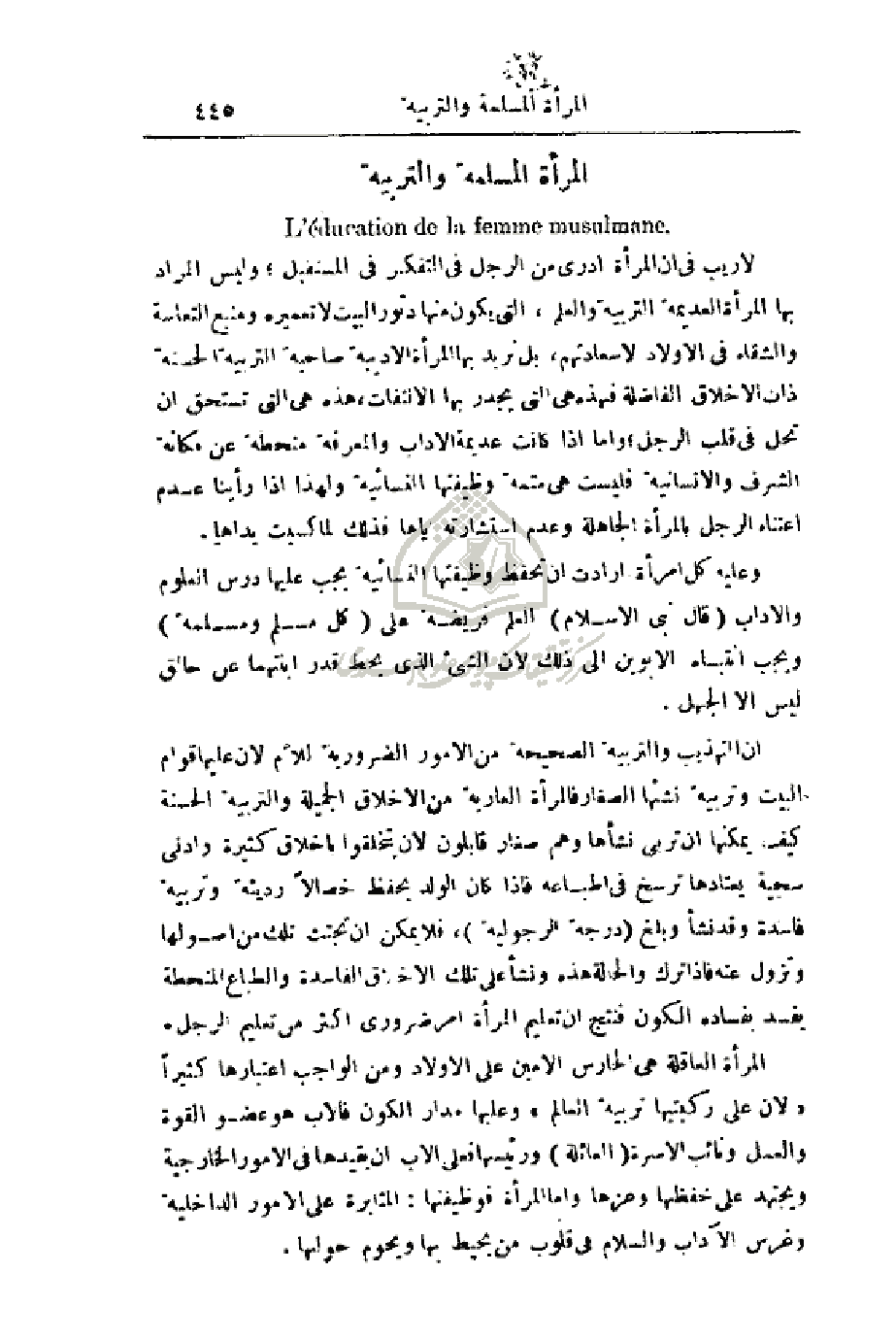 وعليه كل امرأة أرادت أن تحفظ وظيفتها النسائية يجب عليها درس العلوم والآداب (قال نبي الإسلام) العلم فريضة على (كل مسلم ومسلمة) ويجب انتباه الأبوين إلى ذلك لأن الشيء الذي يحط قدر ابنتهما عن حالق ليس إلا الجهل.