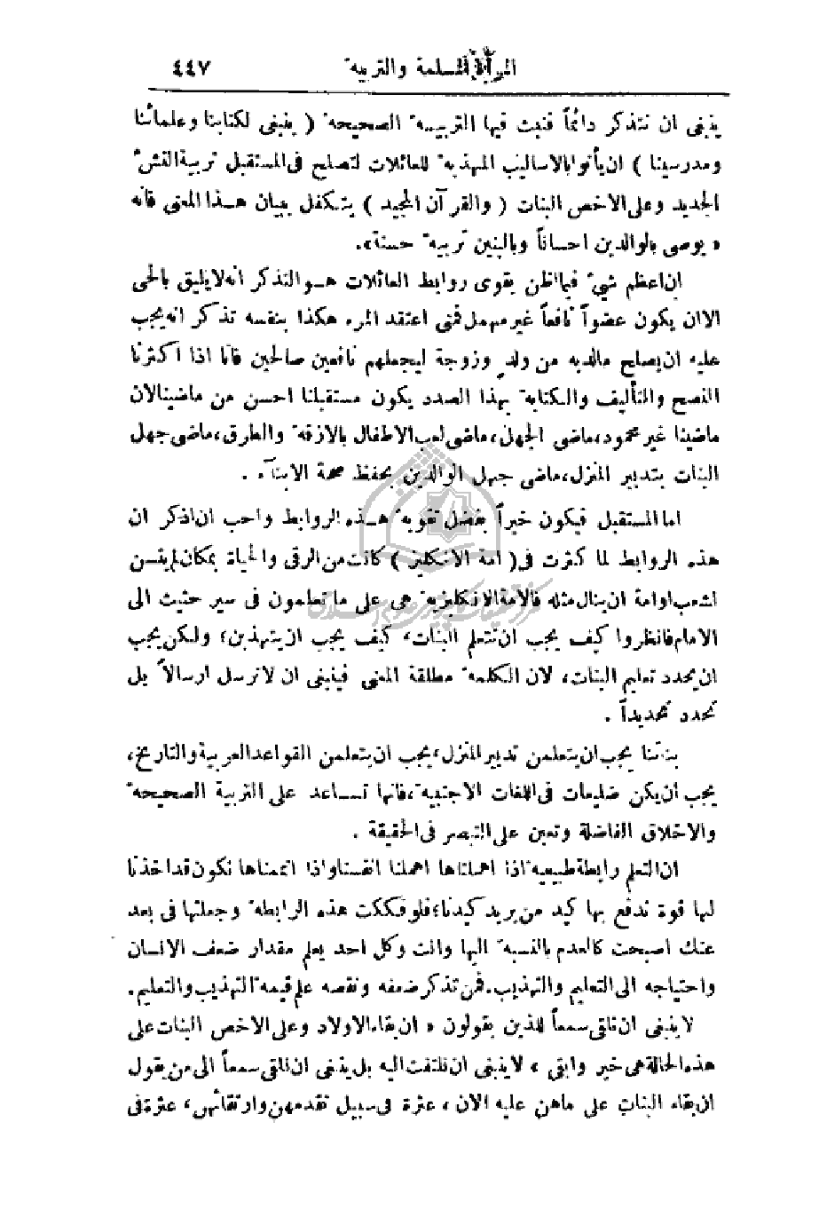 ينبغي أن نتذكر دائماً فنبث فيها التربية الصحيحة (ينبغي لكتابنا وعلمائنا ومدرسينا) أن يأتوا بالأساليب المهذبة للعائلات لتصلح في المستقبل تربية النشء الجديد وعلى الأخص البنات (والقرآن المجيد) يتكفل ببيان هذا المعنى فأنه (يوصي بالوالدين إحساناً وبالبنين تربية حسنة).