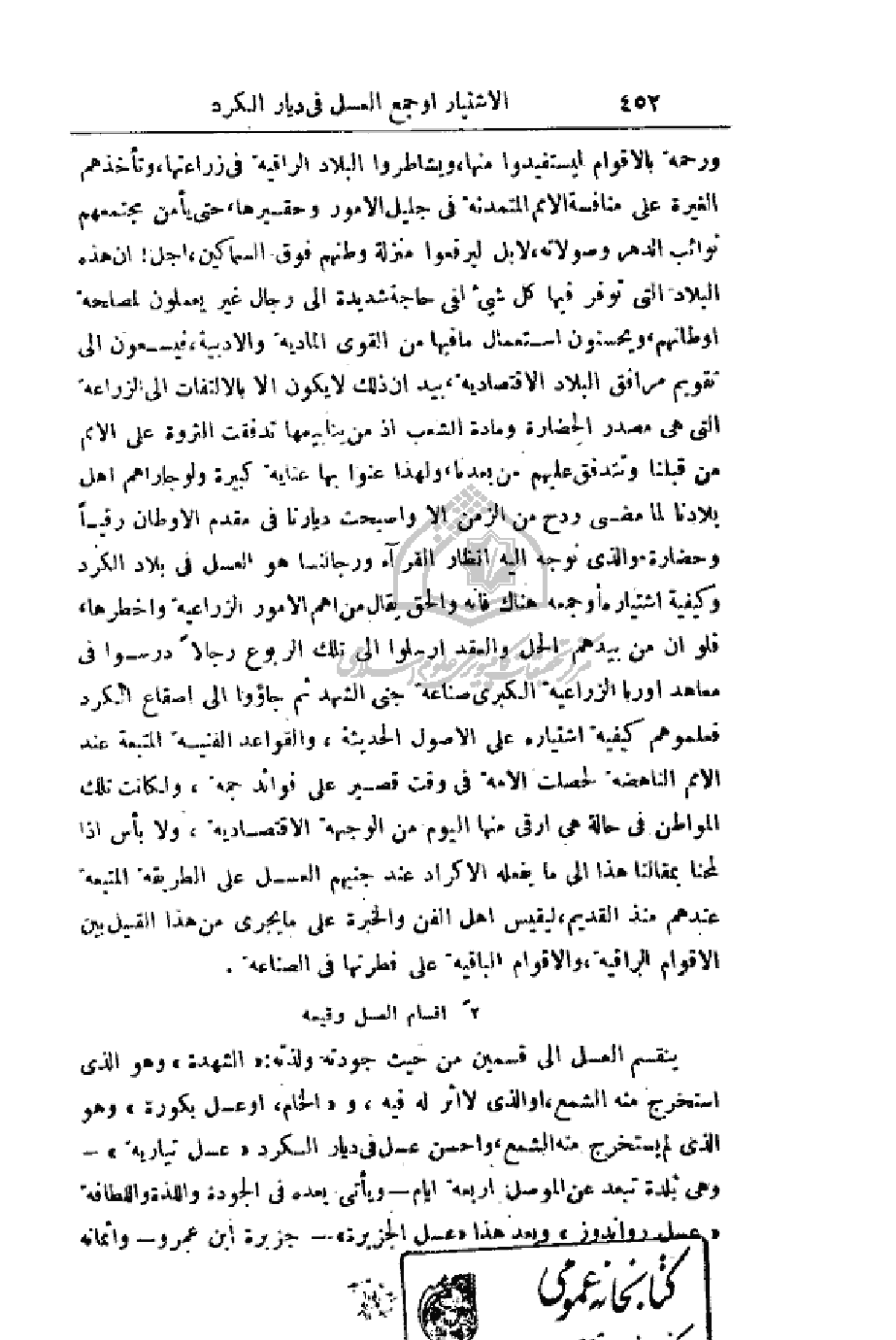 ورحمة بالأقوام ليستفيدوا منها، ويشاطروا البلاد الراقية في زراعتها، وتأخذهم الغيرة على منافسة الأمم المتمدنة في جليل الأمور وحقيرها، حتى يأمن مجتمعهم نوائب الدهر وصولاته، لا بل ليرفعوا منزلة وطنهم فوق السماكين، أجل! أن هذه البلاد التي توفر فيها كل شيء لفي حاجة شديدة إلى رجال غير يعملون لمصلحة اوطانهم، ويحسنون استعمال ما فيها من القوى المادية والأدبية، فيسعون إلى تقويم مرافق البلاد الاقتصادية، بيد أن ذلك لا يكون إلا بالالتفات إلى الزراعة التي هي مصدر الحضارة ومادة الشعب إذ من ينابيعها تدفقت الثروة على الأمم من قبلنا وتتدفق عليهم من بعدنا، ولهذا عنوا بها عناية كبيرة ولو جاراهم أهل بلادنا لما مضى ردح من الزمن إلا وأصبحت ديارنا في مقدم الأوطان رقياً وحضارة والذي نوجه إليه أنظار القراء ورجالنا هو العسل في بلاد الكرد وكيفية اشتياره أو جمعه هناك فأنه والحق يقال من أهم الأمور الزراعية وأخطرها، فلو أن من بيدهم الحل والعقد أرسلوا إلى تلك الربوع رجالاً درسوا في معاهد أوربا الزراعية الكبرى صناعة جنى الشهد ثم جاءوا إلى أصقاع الكرد فعلموهم كيفية اشتياره على الأصول الحديثة، والقواعد الفنية المتبعة عند الأمم الناهضة لحصلت الأمة في وقت قصير على فوائد جمة، ولكانت تلك المواطن في حالة هي أرقى منها اليوم من الوجهة الاقتصادية، ولا بأس إذا لمحنا بمقالنا هذا إلى ما يفعله الأكراد عند جنيهم العسل على الطريقة المتبعة عندهم منذ القديم، ليقيس أهل الفن والخبرة على ما يجري من هذا القبيل بين الأقوام الراقية، والأقوام الباقية على فطرتها في الصناعة.