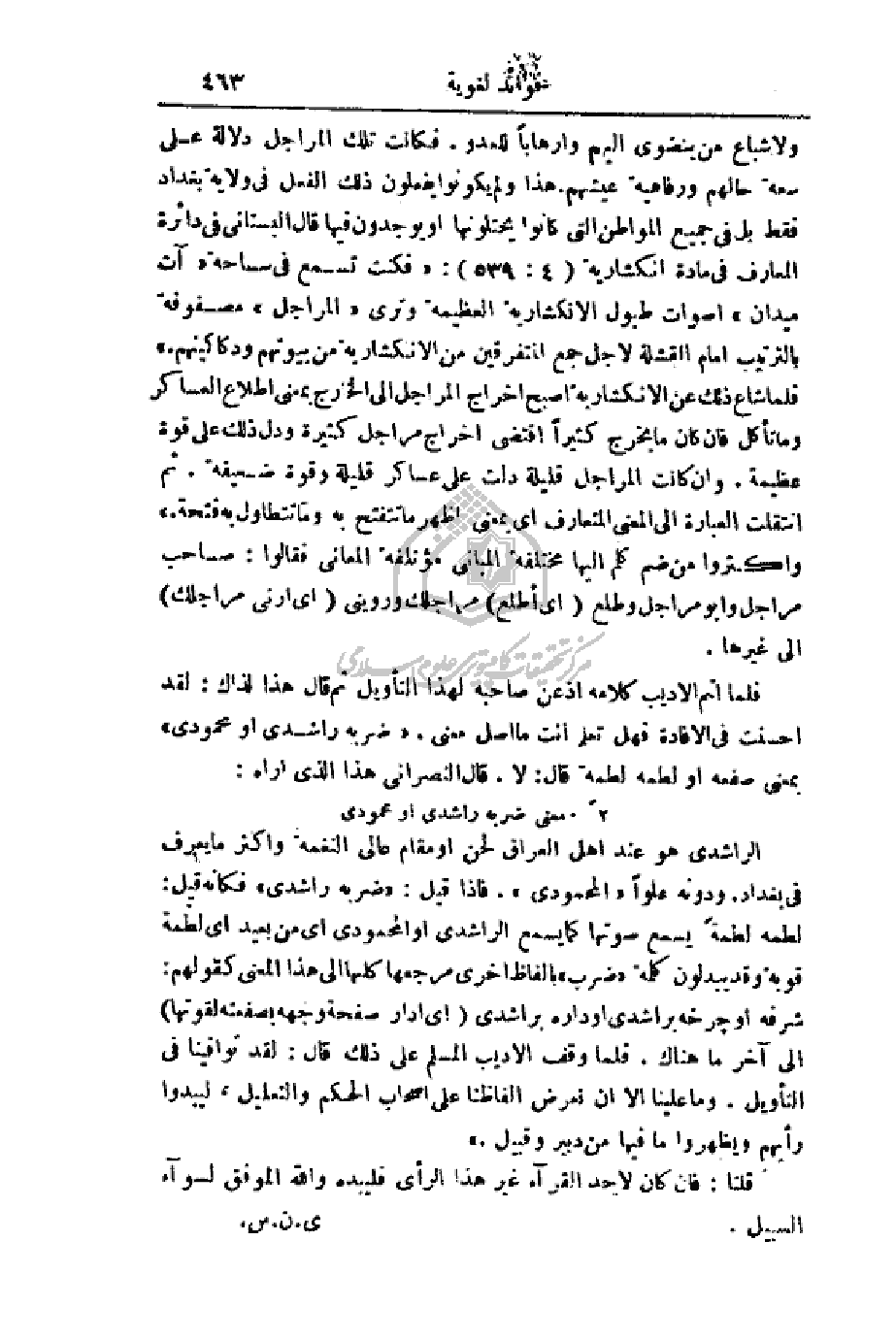 فلما أتم الأديب كلامه أذعن صاحبه لهذا التأويل ثم قال هذا لذاك: لقد أحسنت في الإفادة فهل تعلم أنت ما أصل معنى. (ضربة راشدي أو محمودي) بمعنى صفعه أو لطمه لطمة قال: لا. قال النصراني هذا الذي أراه: