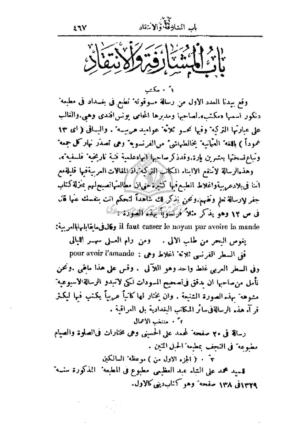 وفي السطر العربي غلط واحد وهو اللآلى. وقس على هذا ما بقي ونحن نأمل من صاحبها أن يدقق في تصحيح المسودات لكي لا تبدو الرسالة الأسبوعية مشوهة بهذه الصورة الشنيعة. وأن يختار لها كاتباً عربياً يكتب فيها ليكثر قراء هذه الرسالة في سائر المكاتب البغدادية بل العراقية.
