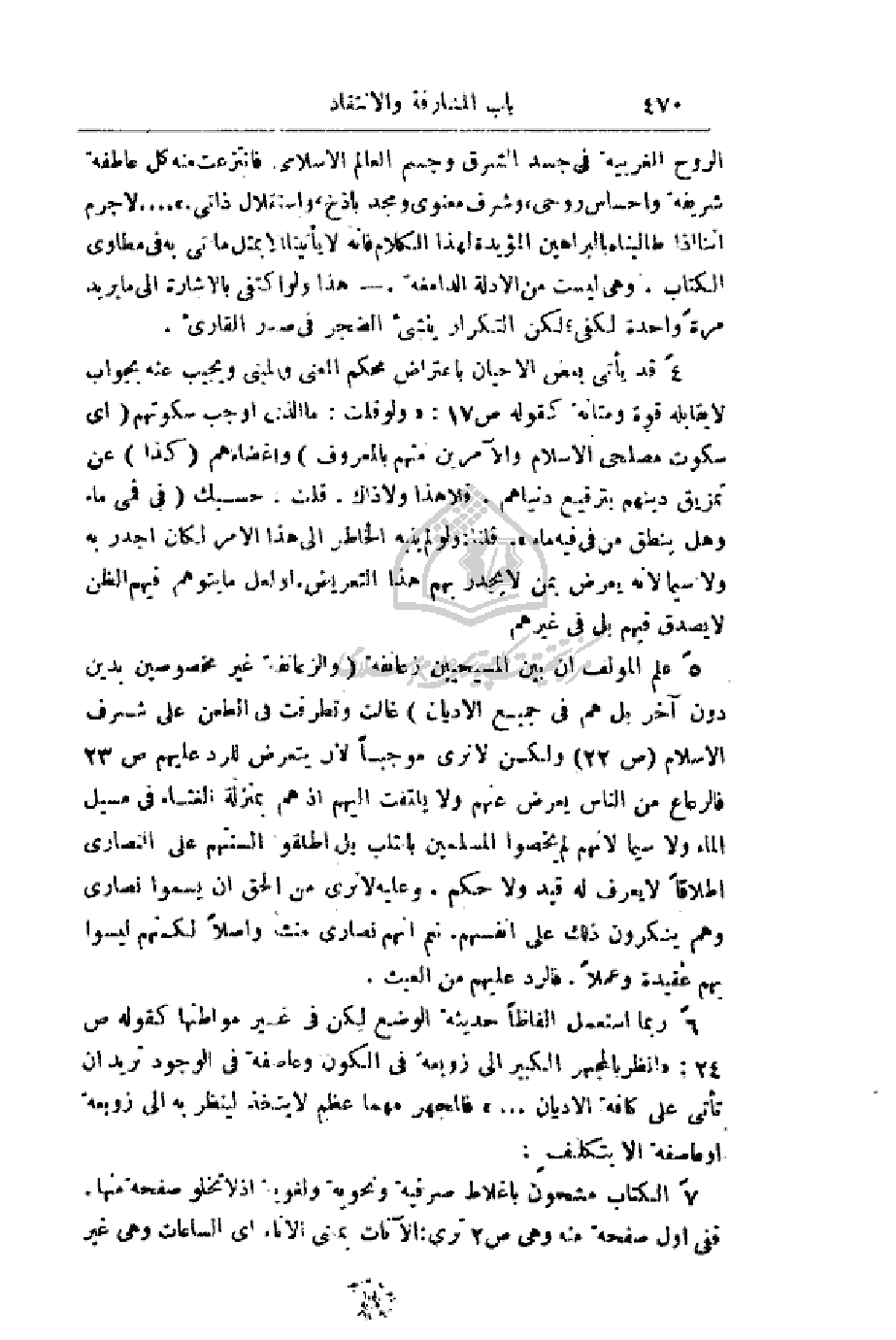 5: علم المؤلف أن بين المسيحيين زعانفة (والزعانفة غير مخصوصين بدين دون آخر بل هم في جميع الأديان) غالت وتطرفت في الطعن على شرف الإسلام (ص 22) ولكن لا نرى موجباً لأن يتعرض للرد عليهم ص 23 فالرعاع من الناس يعرض عنهم ولا يلتفت إليهم إذ هم بمنزلة الغثاء في مسيل الماء ولا سيما لأنهم لم يخصوا المسلمين بالثلب بل أطلقوا ألسنتهم على النصارى إطلاقاً لا يعرف له قيد ولا حكم. وعليه لا نرى من الحق أن يسموا نصارى وهم ينكرون ذلك على أنفسهم. نعم انهم نصارى منشأ واصلاً لكنهم ليسوا بهم عقيدة وعملاً. فالرد عليهم من العبث.
