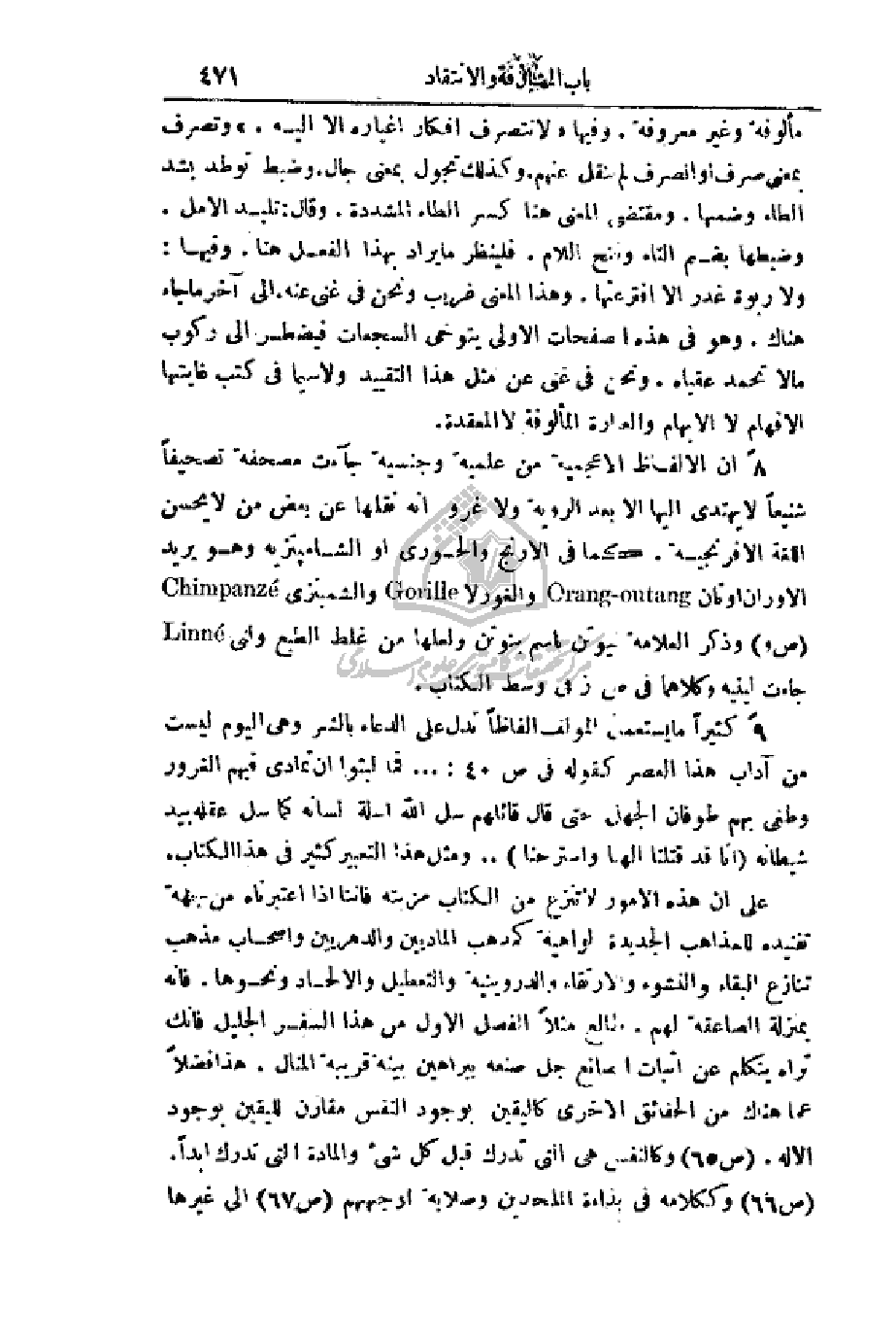 8: إن الألفاظ الأعجمية من علمية وجنسية جاءت مصحفة تصحيفاً شنيعاً لا يهتدي إليها إلا بعد الروية ولا غرو أنه نقلها عن بعض من لا يحسن اللغة الإفرنجية. كما في الارنج والجوري أو الشامبنزيه وهو يريد الاوران اوتان - والغورلا والشمبنزي (ص و) وذكر العلامة نيوتن باسم ينوتن ولعلها من غلط الطبع ولني جاءت لينيه وكلاهما في ص ز وسط الكتاب.