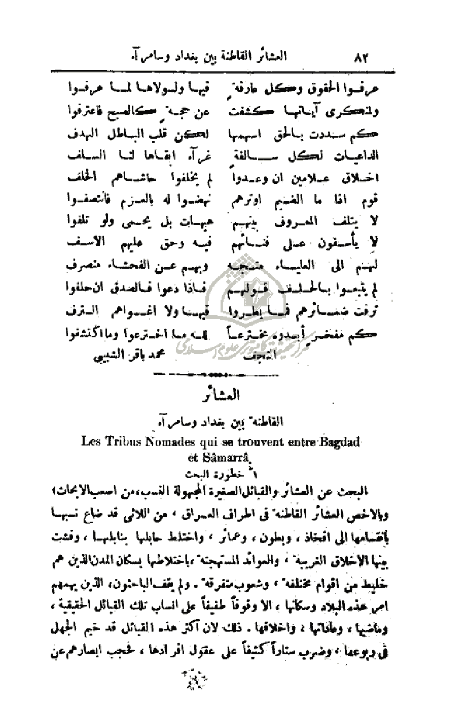 البحث عن العشائر والقبائل الصغيرة المجهولة النسب، من اصعب الأبحاث، وبالأخص العشائر القاطنة في أطراف العراق، من اللائي قد ضاع نسبها بانقسامها إلى افخاذ، وبطون، وعمائر، واختلط حابلها بنابلها، وفشت بينها الأخلاق الغريبة، والعوائد المستهجنة، باختلاطها بسكان المدن الذين هم خليط من أقوام مختلفة، وشعوب متفرقة. ولم يقف الباحثون، الذين يهمهم أمر هذه البلاد وسكانها، إلا وقوفاً طفيفاً على انساب تلك القبائل الحقيقية، وماضيها، وعاداتها، وأخلاقها. ذلك لأن اكثر هذه القبائل قد خيم الجهل في ربوعها، وضرب ستاراً كثيفاً على عقول أفرادها، فحجب أبصارهم عن