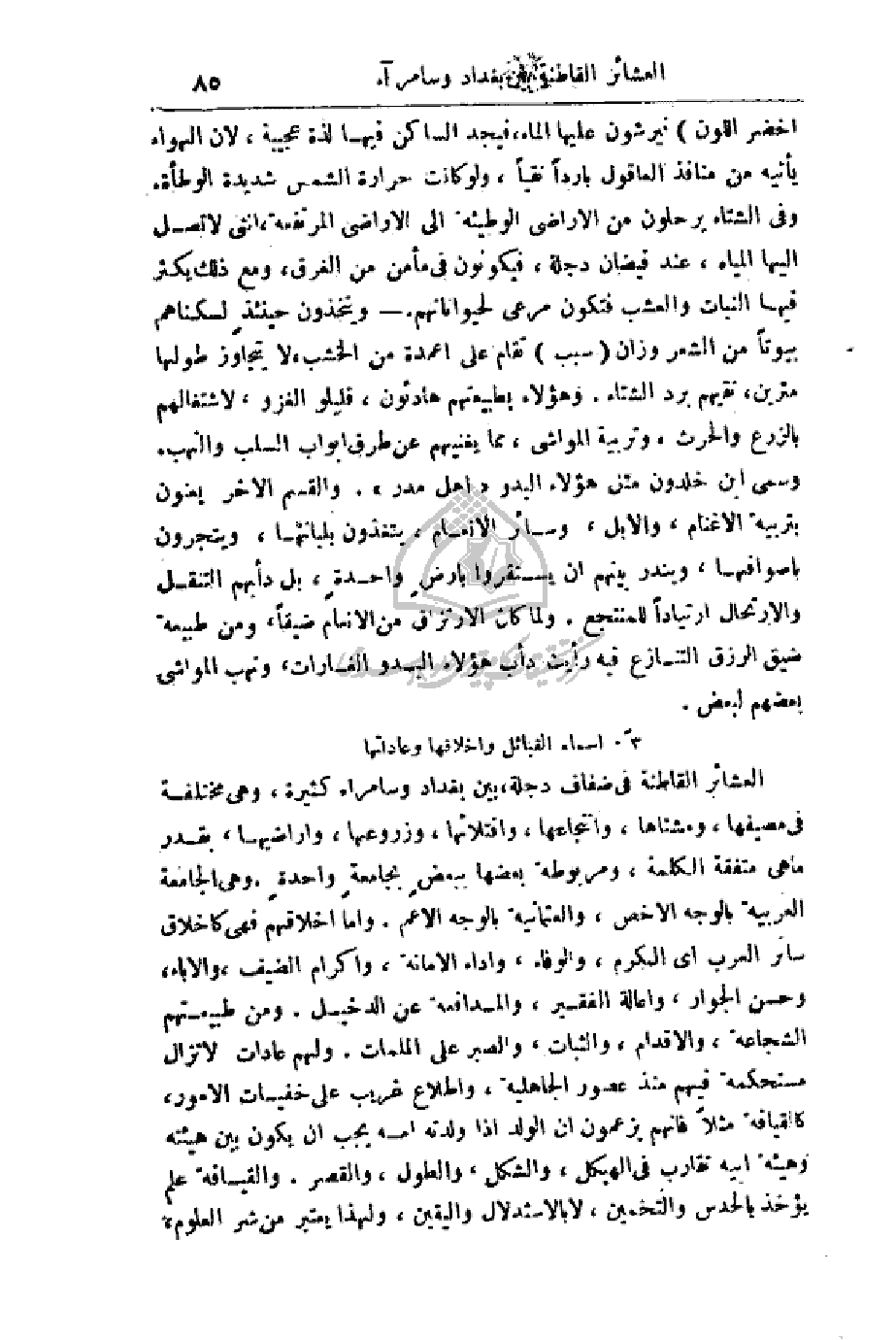 أخضر اللون) فيرشون عليها الماء، فيجد الساكن فيها لذة عجيبة، لأن الهواء يأتيه من منافذ العاقول بارداً نقياً، ولو كانت حرارة الشمس شديدة الوطأة. وفي الشتاء يرحلون من الأراضي الوطيئة إلى الأراضي المرتفعة، التي لاتصل إليها المياه، عند فيضان دجلة، فيكونون في مأمن من الغرق، ومع ذلك يكثر فيها النبات والعشب فتكون مرعى لحيواناتهم. - ويتخذون حينئذٍ لسكانهم بيوتاً من الشعر وزان (سبب) تقام على أعمدة من الخشب لا يتجاوز طولها مترين، تقيهم برد الشتاء. وهؤلاء بطبيعتهم هادئون، قليلو الغزو، لاشتغالهم بالزرع والحرث، وتربية المواشي، مما يغنيهم عن طرق أبواب السلب والنهب. وسمى ابن خلدون مثل هؤلاء البدو (أهل مدر). والقسم الأخر يعنون بتربية الاغنام، والابل، وسائر الأنعام، يتغذون بلبانها، ويتجرون بأصوافها، ويندر بينهم أن يستقروا بأرض واحدةٍ، بل دأبهم التنقل والارتحال ارتياداً للمنتجع. ولما كان الارتزاق من الأنعام ضيقاً، ومن طبيعة ضيق الرزق التنازع فيه رأيت دأب هؤلاء البدو الغارات، ونهب المواشي بعضهم لبعض.