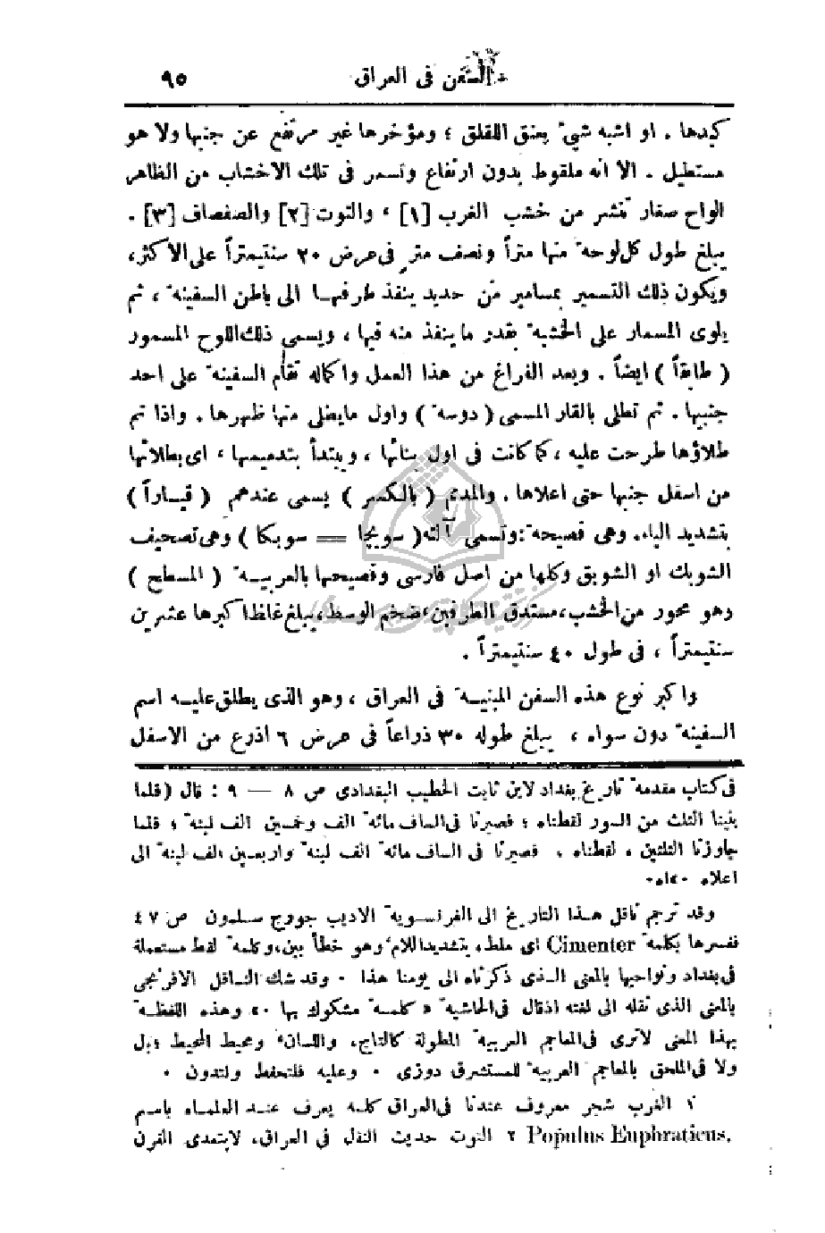 كبدها. أو أشبه شيء بعنق اللقلق؛ ومؤخرها غير مرتفع عن جنبها ولا هو مستطيل. ألا أنه ملقوط بدون ارتفاع وتسمر في تلك الأخشاب من الظاهر ألواح صغار تنشر من خشب الغرب، والتوت والصفصاف يبلغ طول كل لوحة منها متراً ونصف مترٍ في عرض 20 سنتيمتراً على الأكثر، ويكون ذلك التسمير بمسامير من حديد ينفذ طرفها إلى باطن السفينة، ثم يلوى المسمار على الخشبة بقدر ما ينفذ منه فيها، ويسمى ذلك اللوح المسمور (طابقاً) أيضاً. وبعد الفراغ من هذا العمل وإكماله تقام السفينة على أحد جنبيها. ثم تطلى بالقار المسمى (دوسة) وأول ما يطلى منها ظهرها. وإذا تم طلاؤها طرحت عليه، كما كانت في أول بنائها، ويبتدأ بتدميمها، اي بطلائها من اسفل جنبها حتى أعلاها. والمدمم (بالكسر) يسمى عندهم (قياراً) بتشديد الياء. وهي فصيحة: وتسمى آلته (سوبجا - سوبكا) وهي تصحيف الشوبك أو الشوبق وكلها من اصل فارسي وفصيحها بالعربية (المسطح)