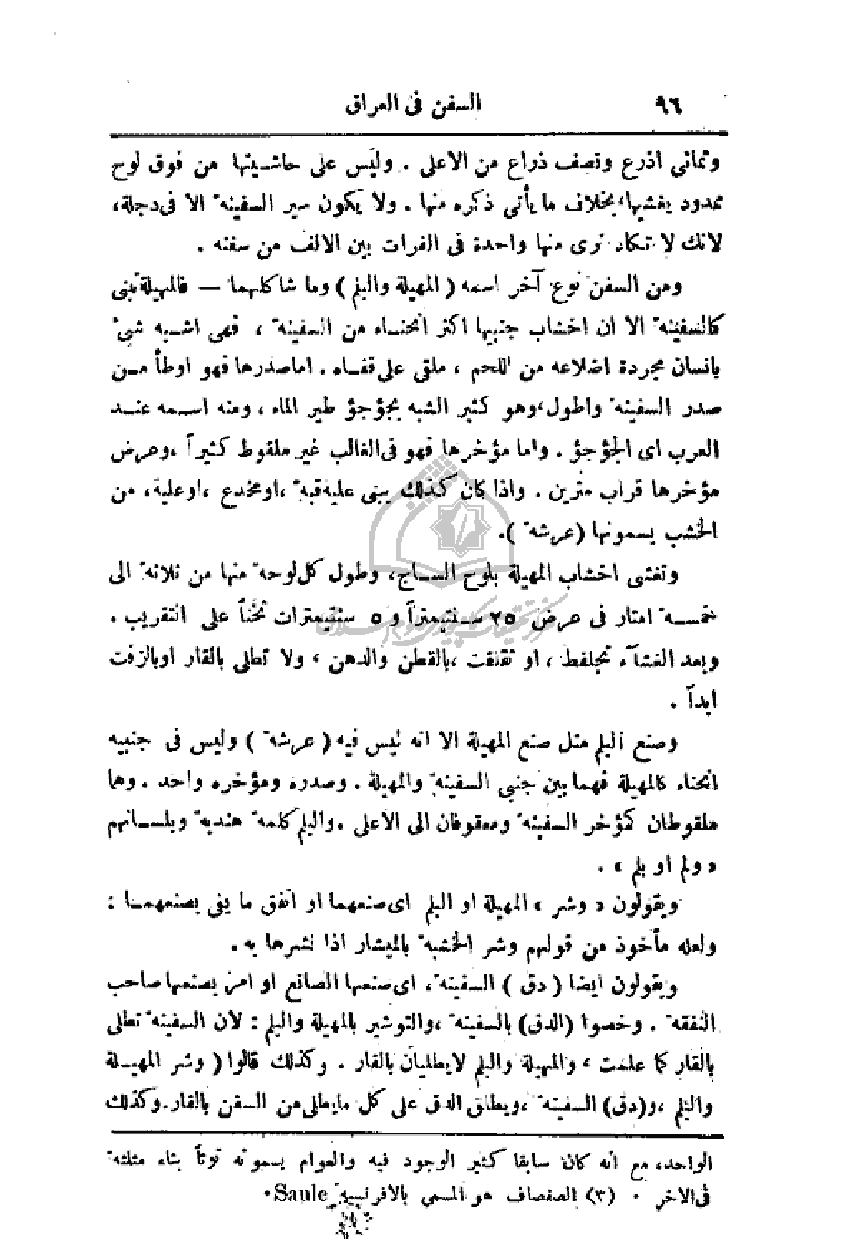 وثماني اذرع ونصف ذراع من الأعلى. وليس على حاشيتها من فوق لوح ممدود يغشيها، بخلاف ما يأتي ذكره منها. ولا يكون سير السفينة إلا في دجلة، لأنك لا تكاد ترى منها واحدة في الفرات بين الألف من سفنه.