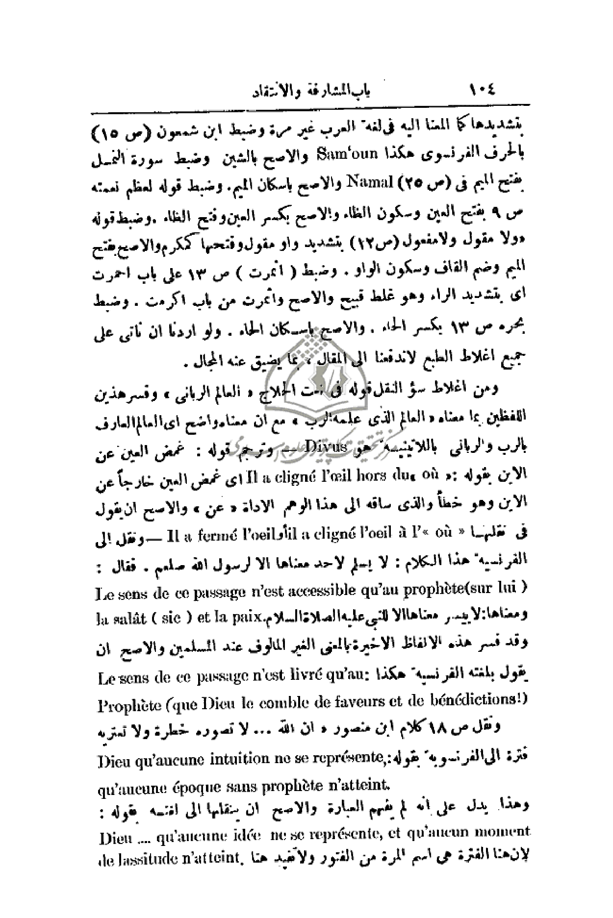 النقل قوله في نعت الحلاج (العالم الرباني) وفسر هذين اللفظيين بما معناه (العالم الذي ومن أغلاط سوء علمه الرب) مع إن معناه واضح أي العالم العارف بالرب والرباني باللاتينية هو - وترجم قوله: غمض العين عن الاين بقوله: أي غمض العين خارجاً عن الاين وهو خطأ والذي ساقه إلى هذا الوهم الأداة (عن) والأصح أن يقول في نقلها أو - ونقل إلى الفرنسية هذا الكلام: لا يسلم لأحد معناها إلا لرسول الله صلى الله عليه وسلم. فقال: ومعناها: لا ييسر معناها إلا للنبي عليه الصلاة والسلام وقد فسر هذه الألفاظ الأخيرة بالمعنى الغير المألوف عند المسلمين والأصح أن يقول بلغته الفرنسية هكذا: