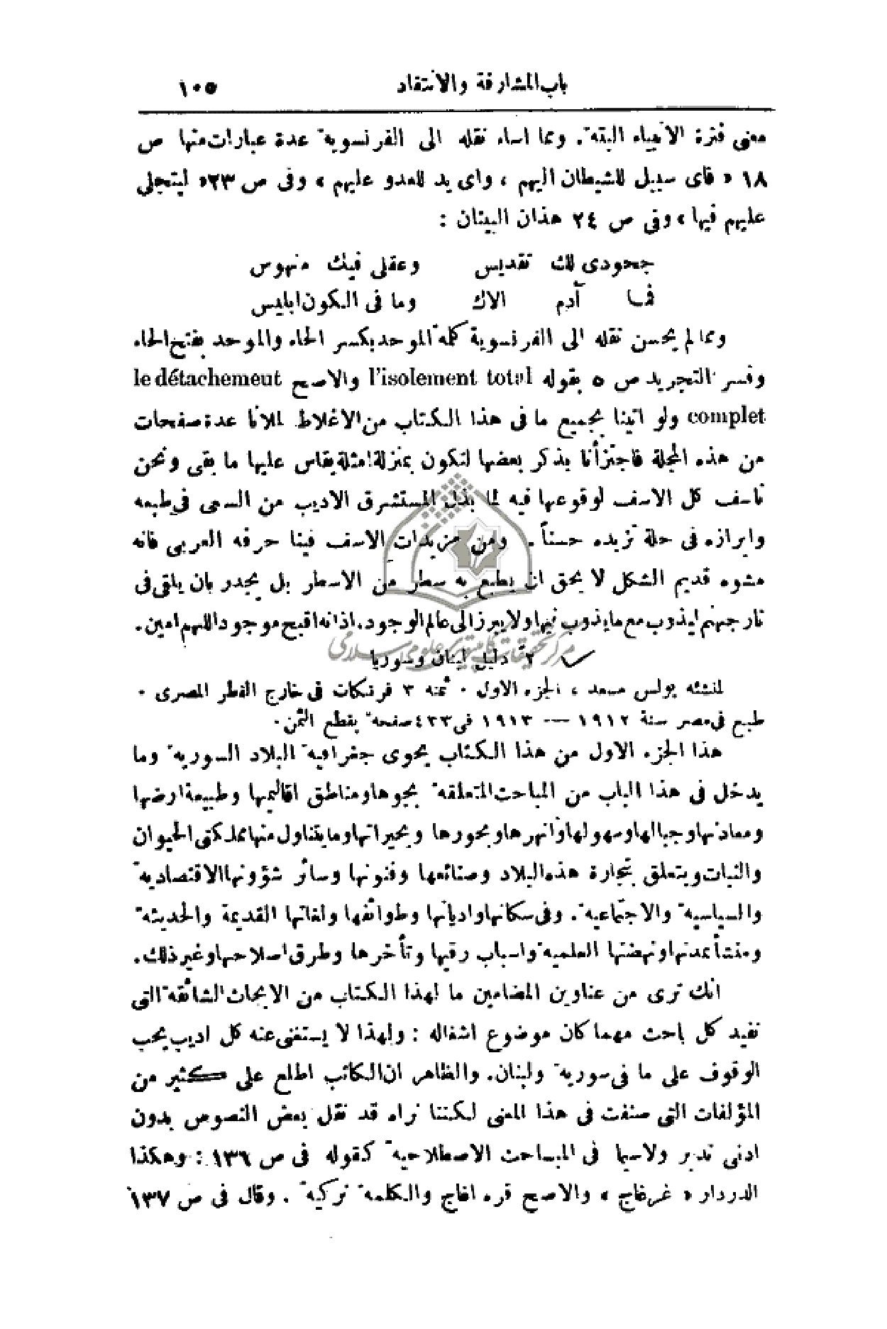 مهما كان موضوع أشغاله: ولهذا لا يستغني عنه كل أديب يحب الوقوف على ما في سورية ولبنان. والظاهر إن الكتاب اطلع على كثير من المؤلفات التي صنفت في هذا المعنى لكننا نراه قد نقل بعض النصوص بدون أدنى تدبر ولا سيما في المباحث الاصطلاحية كقوله في ص 136: وهكذا الدردار (غرغاج) والأصح قره اغاج والكلمة تركية. وقال في ص 137