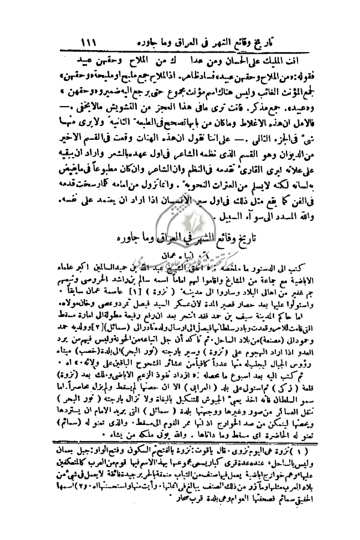 ثم كتب إليه بعد أسبوع ما محصله: (ازداد نفوذ الزعيم الاباضي وذلك بعد (نزوة) قلعة (زكي) ثم استولى على بلد. (العرابي) غلا أن حصنها لم يسقط ولم يزل محاصراً. أما سمو السلطان فإنه أخذ يعبئ الجيوش للتنكيل بالبغاة ولا تزال بارجته (نور البحر) تنقل العساكر من صور وغيرها ووجهتها بلدة (سمائل) التي يريد الإمام أن يستردها ويحصنها ليتمكن من صد الخوارج إذ أنها ممر القوم إلى مسقط. والذي تعنو له (سمائم) تعنو له الحاضرة أي مسقط وما دانها. والله يؤتي ملكه من يشاء.